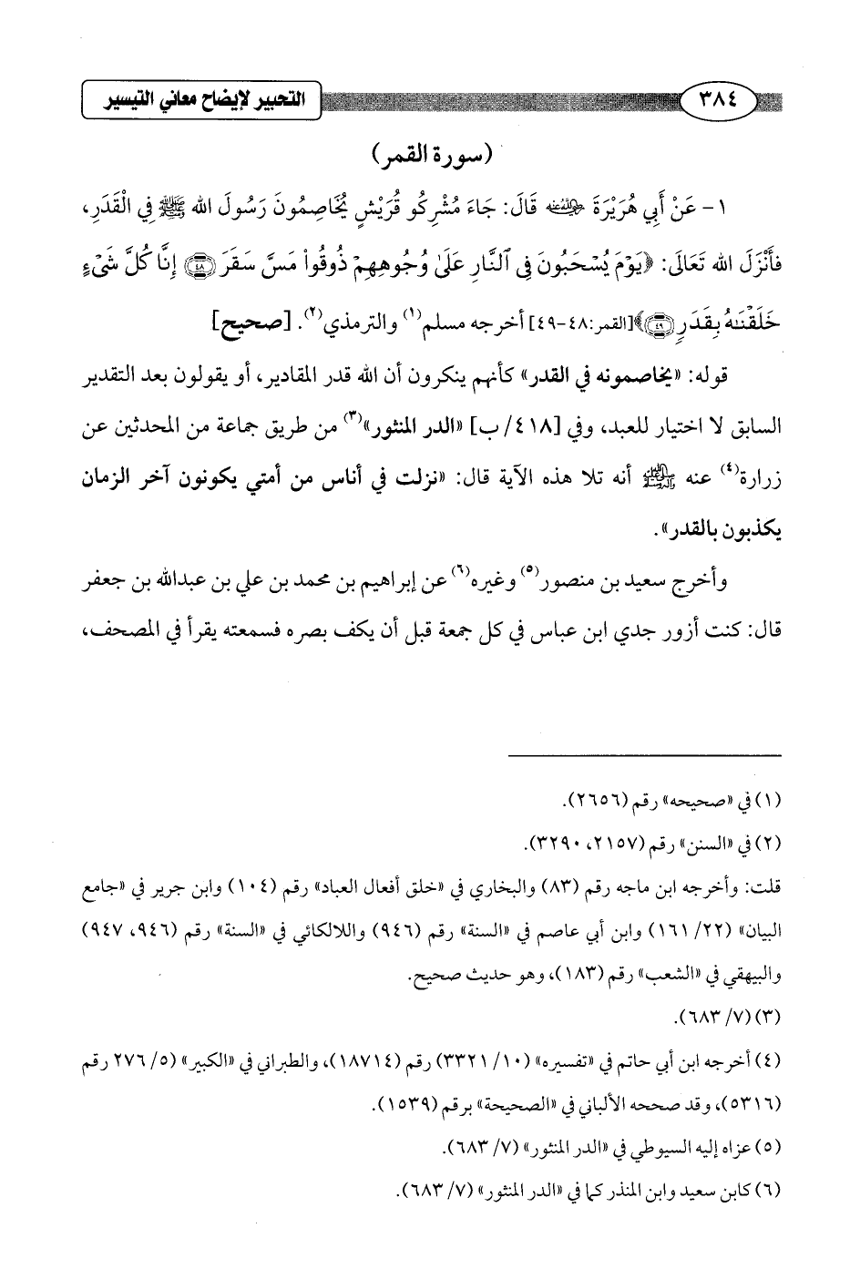 1 - عَنْ أَبِي هُرَيْرَةَ - رضي الله عنه - قَالَ: جَاءَ مُشْرِكُو قُرَيْشٍ يُخَاصِمُونَ رَسُولَ الله - صلى الله عليه وسلم - فِي الْقَدَرِ، فأَنْزَلَ الله تَعالَى: {يَوْمَ يُسْحَبُونَ فِي النَّارِ عَلَى وُجُوهِهِمْ ذُوقُوا مَسَّ سَقَرَ (48) إِنَّا كُلَّ شَيْءٍ خَلَقْنَاهُ بِقَدَرٍ (49)} [القمر: 48 - 49] أخرجه مسلم (¬1) والترمذي (¬2). [صحيح]