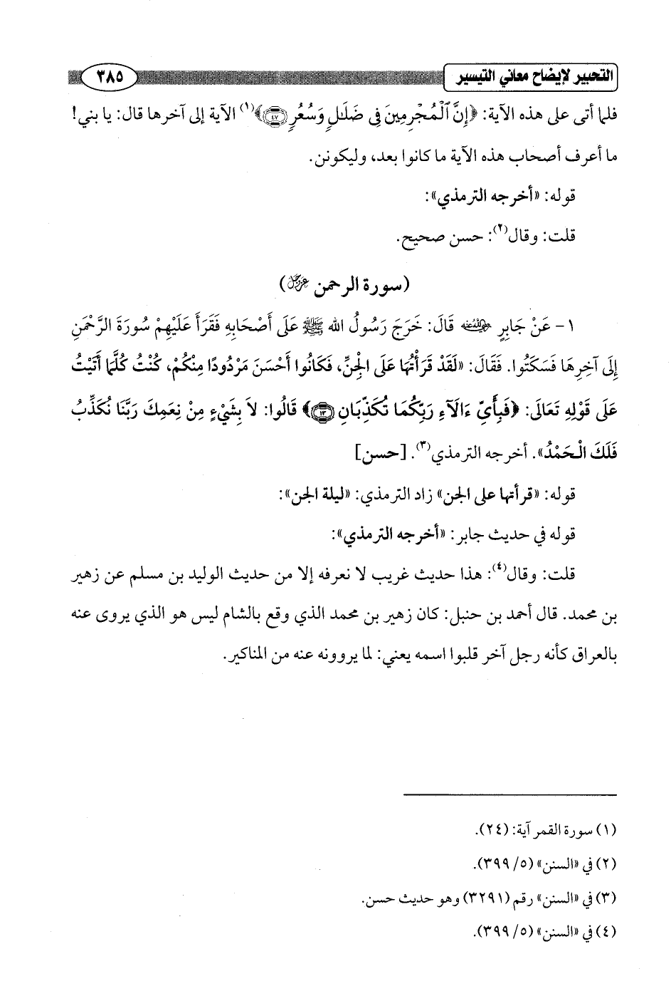 1 - عَنْ جَابِرٍ - رضي الله عنه - قَالَ: خَرَجَ رَسُولُ الله - صلى الله عليه وسلم - عَلَى أَصْحَابِهِ فَقَرَأَ عَلَيْهِمْ سُورَةَ الرَّحمَنِ إِلَى آخِرِهَا فَسَكَتُوا. فَقَالَ: "لَقَدْ قَرَأْتُهَا عَلَى الْجِنِّ، فَكانُوا أَحْسَنَ مَرْدُودًا مِنْكُمْ، كُنْتُ كُلَّمَا أَتَيْتُ عَلَى قَوْلهِ تَعالَى: {فَبِأَيِّ آلَاءِ رَبِّكُمَا تُكَذِّبَانِ (13)} قَالُوا: لا بِشَيْءٍ مِنْ نِعَمِكَ رَبَّنا نُكَذِّبُ فَلَكَ الْحَمْدُ". أخرجه الترمذي (¬3). [حسن]