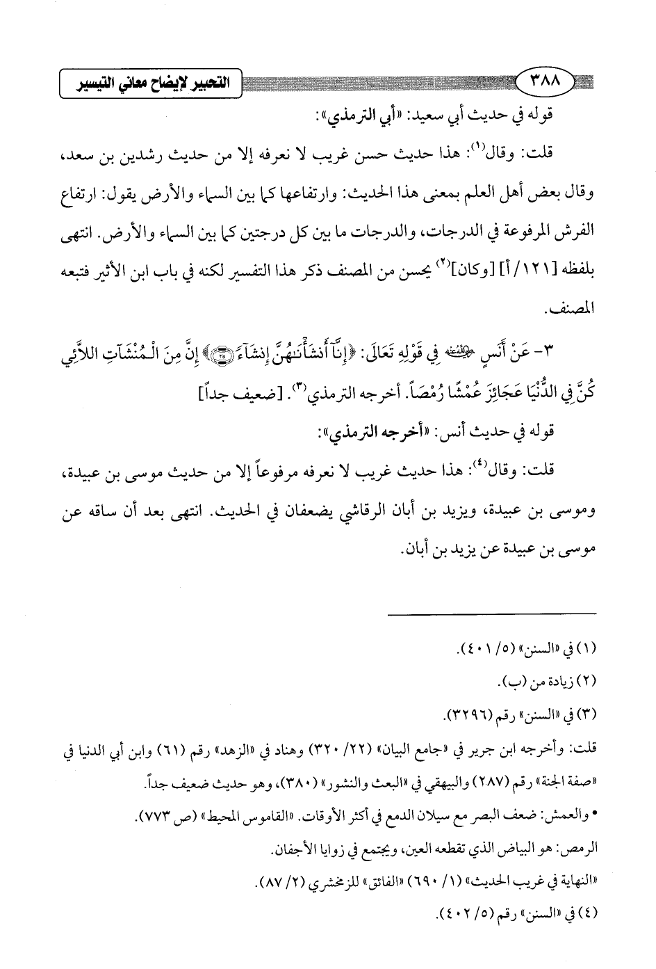 3 - عَنْ أَنَسٍ - رضي الله عنه - في قَوْلِهِ تَعَالَى: {إِنَّا أَنْشَأْنَاهُنَّ إِنْشَاءً (35)} إِنَّ مِنَ المُنْشَآتِ اللاَّئِي كُنَّ فِي الدُّنْيَا عَجَائِزَ عُمْشًا رُمْصَاً. أخرجه الترمذي (¬3). [ضعيف جداً]