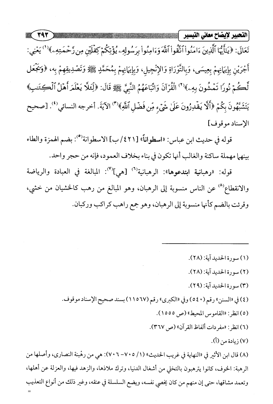 تَعَالَى: {يَاأَيُّهَا الَّذِينَ آمَنُوا اتَّقُوا اللَّهَ وَآمِنُوا بِرَسُولِهِ يُؤْتِكُمْ كِفْلَيْنِ مِنْ رَحْمَتِهِ} (¬1) يَعْنِي: أَجْرَيْنِ بِإِيمَانِهِمْ بِعِيسَى، وَبِالتَّوْراةِ والإِنْجِيلِ، وَبِإِيمَانِهِمْ بِمُحَمَّدٍ - صلى الله عليه وسلم - وتَصْدِيقِهِمْ بِه، {وَيَجْعَلْ لَكُمْ نُورًا تَمْشُونَ بِهِ} (¬2) الْقُرْآنَ واتَّبَاعَهُمُ النَّبِيَّ - صلى الله عليه وسلم - قَالَ: {لِئَلَّا يَعْلَمَ أَهْلُ الْكِتَابِ} يَتَشَبَّهُونَ بِكُمْ {أَلَّا يَقْدِرُونَ عَلَى شَيْءٍ مِنْ فَضْلِ اللَّهِ} (¬3) الآيَةَ. أخرجه النسائي (¬4). [صحيح الإسناد موقوف]