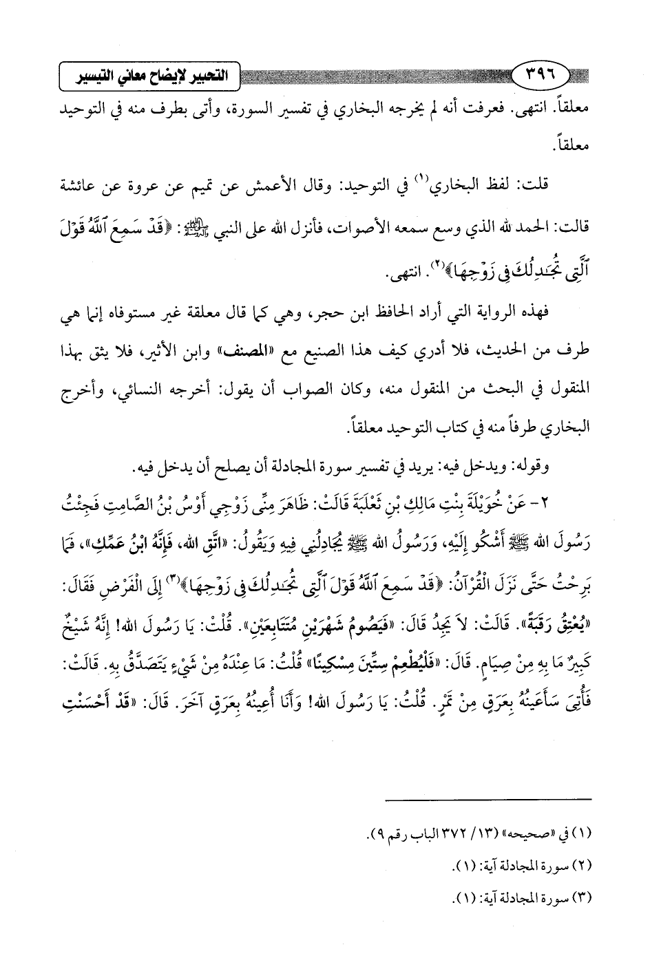 قلت: لفظ البخاري (¬1) في التوحيد: وقال الأعمش عن تميم عن عروة عن عائشة قالت: الحمد لله الذي وسع سمعه الأصوات، فأنزل الله على النبي - صلى الله عليه وسلم -: {قَدْ سَمِعَ اللَّهُ قَوْلَ الَّتِي تُجَادِلُكَ فِي زَوْجِهَا} (¬2). انتهى.