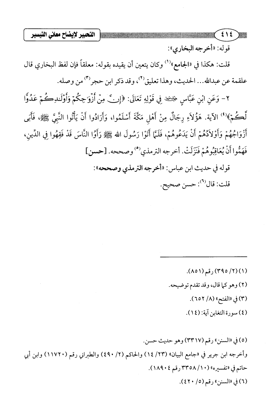 2 - وَعَنِ ابْنِ عَبَّاسٍ - رضي الله عنهما - فِي قَوْلِهِ تَعَالَى: {إِنَّ مِنْ أَزْوَاجِكُمْ وَأَوْلَادِكُمْ عَدُوًّا لَكُمْ} (¬4) الآية. هَؤُلاَءِ رِجالٌ مِنْ أَهْلِ مَكَّةَ أَسْلَمُوا، وَأَرَادُوا أَنْ يَأْتُوا النَّبِيَّ - صلى الله عليه وسلم -، فَأَبَى أَزْوَاجُهُمْ وَأَوْلاَدُهُمْ أَنْ يَدَعُوهُمْ، فَلَمَّا أَتَوْا رَسُولَ الله - صلى الله عليه وسلم - رَأَوُا النَّاسَ قَدْ فَقِهُوا فِي الدِّينِ، فَهَمُّوا أَنْ يُعَاقِبُوهُمْ فَنَزَلَتْ. أخرجه الترمذي (¬5) وصححه. [حسن]