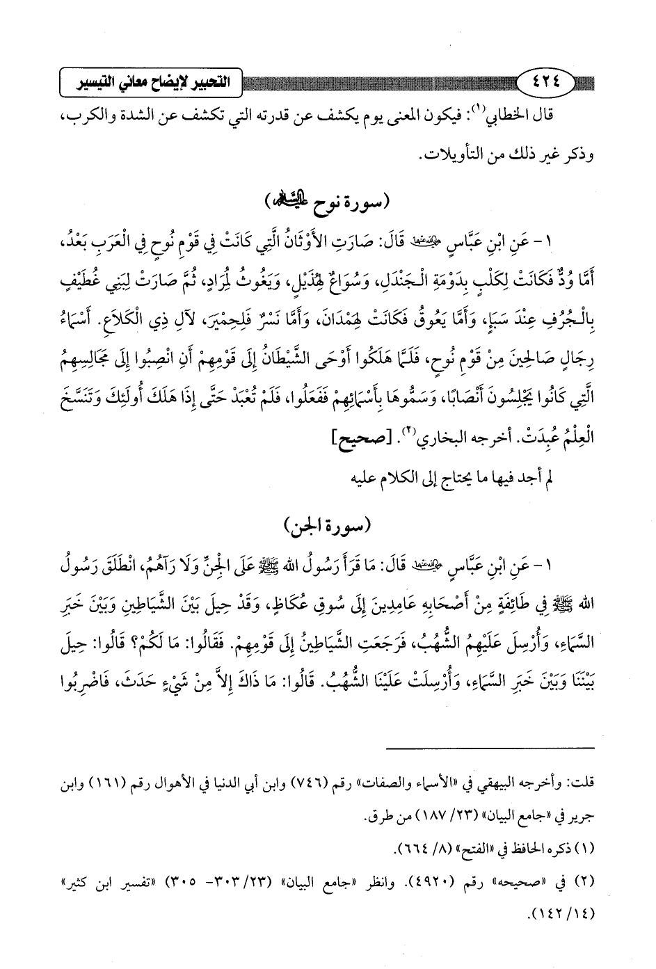 1 - عَنِ ابْنِ عَبَّاسٍ - رضي الله عنهما - قَالَ: صَارَتِ الأَوْثَانُ الَّتِي كَانَتْ فِي قَوْمِ نُوحٍ في الْعَرَبِ بَعْدُ، أَمَّا وُدٌّ فَكَانَتْ لِكَلْبٍ بِدَوْمَةِ الْجَنْدَلِ، وَسُوَاعٌ لِهُذَيْلٍ، وَيَغُوثُ لمُرَادٍ، ثُمَّ صَارَتْ لِبَنِي غُطَيْفٍ بِالْجُرُفِ عِنْدَ سَبَإٍ، وَأَمَّا يَعُوقُ فَكانَتْ لِهَمْدانَ، وَأَمَّا نَسْرٌ فَلِحِمْيَرَ، لآلِ ذِي الْكَلاعِ. أَسْمَاءُ رِجَالٍ صَالحِينَ مِنْ قَوْمِ نُوحٍ، فَلَمَّا هَلَكُوا أَوْحَى الشَّيْطانُ إِلَى قَوْمِهِمْ أَنِ انْصِبُوا إِلَى مَجَالِسِهِمُ الَّتِي كانُوا يَجْلِسُونَ أَنْصَابًا، وَسَمُّوها بِأَسْمائِهِمْ فَفَعَلُوا، فَلَمْ تُعْبَدْ حَتَّى إِذا هَلَكَ أُولَئِكَ وَتَنَسَّخَ الْعِلْمُ عُبِدَتْ. أخرجه البخاري (¬2). [صحيح]