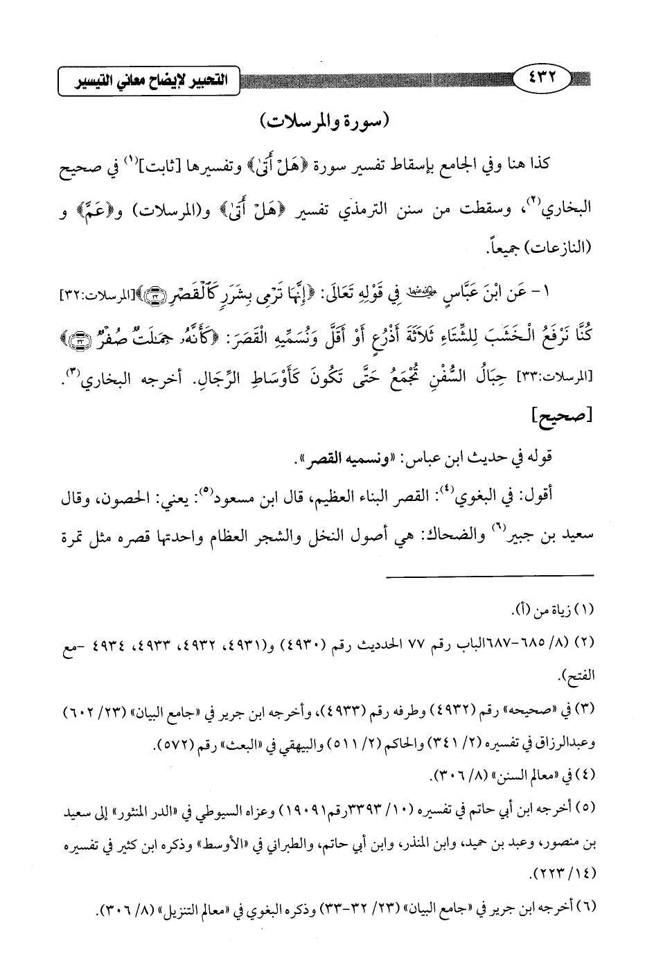 1 - عَن ابْنَ عَبَّاسٍ - رضي الله عنهما - فِي قَوْلِهِ تَعَالَى: {إِنَّهَا تَرْمِي بِشَرَرٍ كَالْقَصْرِ (32)} [المرسلات: 32] كُنَّا نَرْفَعُ الْخَشَبَ لِلشِّتَاءِ ثَلاَثَةَ أَذْرُعٍ أَوْ أَقلَّ وَنُسَمِّيهِ الْقَصَرَ: {كَأَنَّهُ جِمَالَتٌ صُفْرٌ (33)} [المرسلات: 33] حِبَالُ السُّفْنِ تُجْمَعُ حَتَّى تَكُونَ كَأَوْساطِ الرِّجالِ. أخرجه البخاري (¬3). [صحيح]