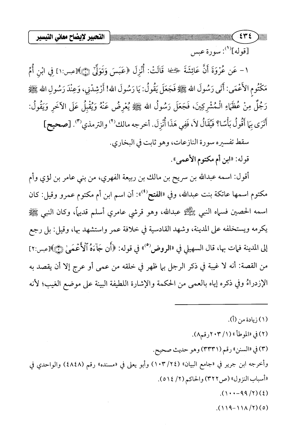 1 - عَن عُرْوَةَ أَنَّ عَائِشَةَ - رضي الله عنها - قَالَتْ: أُنْزِلَ {عَبَسَ وَتَوَلَّى (1)} [عبس: 1] فِي ابْنِ أُمِّ مَكْتُومٍ الأَعْمَى: أَتَى رَسُولَ الله - صلى الله عليه وسلم - فَجَعَلَ يَقُولُ: يَا رَسُولَ الله! أَرْشِدْنِي، وَعِنْدَ رَسُولِ الله - صلى الله عليه وسلم - رَجُلٌ مِنْ عُظَمَاءِ الْمُشْرِكِينَ، فَجَعَلَ رَسُولُ الله - صلى الله عليه وسلم - يُعْرِضُ عَنْهُ وَيُقْبِلُ عَلَى الآخَرِ وَيَقُولُ: أَتَرَى بِمَا أَقُولُ بَأْسًا؟ فَيُقالُ لاَ، فَفِي هَذا أُنْزِلَ. أخرجه مالك (¬2) والترمذي (¬3). [صحيح]