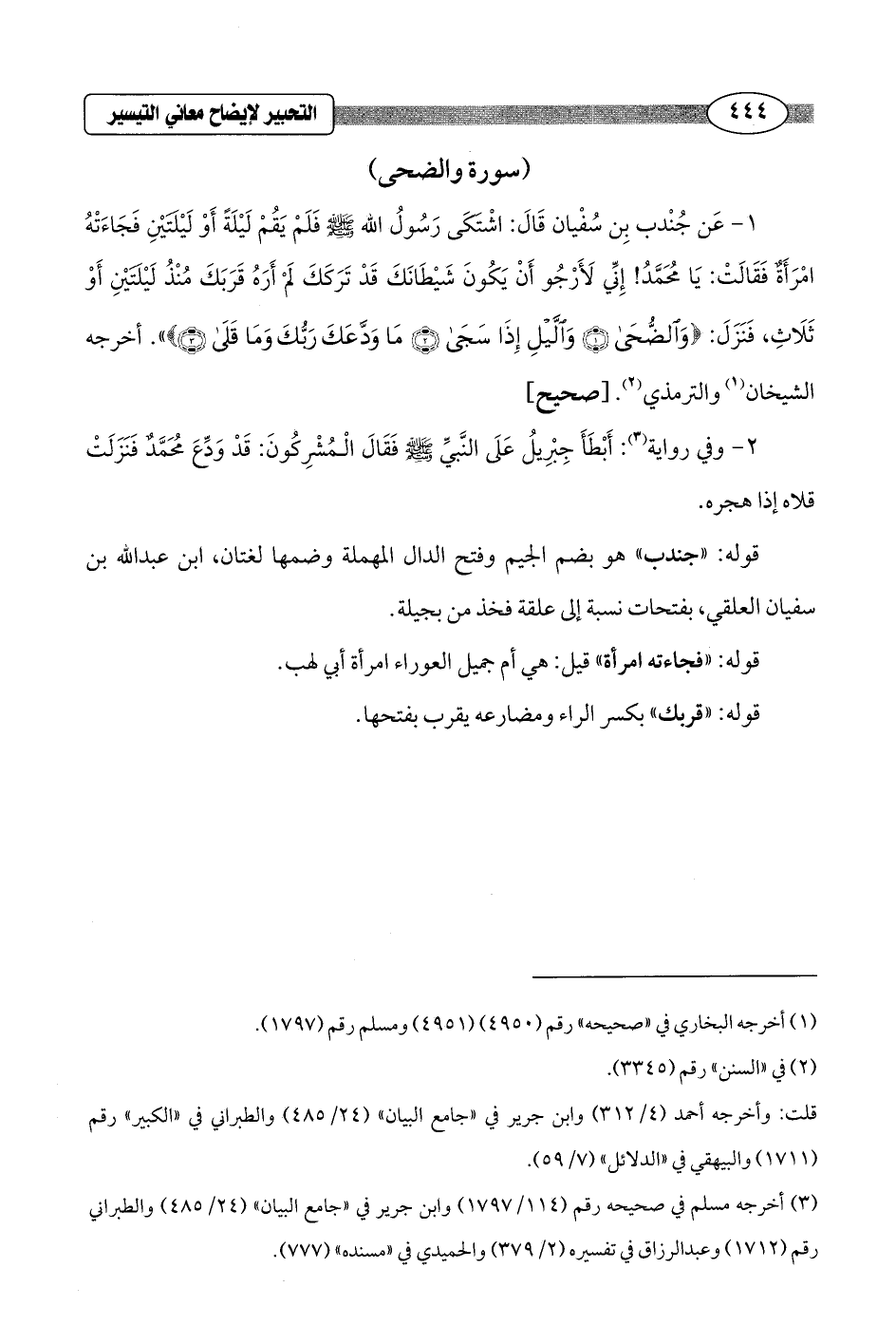 1 - عَن جُنْدب بِن سُفْيان قَالَ: اشْتَكَى رَسُولُ الله - صلى الله عليه وسلم - فَلَمْ يَقُمْ لَيْلَةً أَوْ لَيْلَتَيْنِ فَجاءَتْهُ امْرَأَةٌ فَقَالَتْ: يَا مُحَمَّدُ! إِنِّي لَأَرْجُو أَنْ يَكُونَ شَيْطانَكَ قَدْ تَرَكَكَ لَمْ أَرَهُ قَرَبَكَ مُنْذُ لَيْلَتَيْنِ أَوْ ثَلاثِ، فَنَزَلَ: {وَالضُّحَى (1) وَاللَّيْلِ إِذَا سَجَى (2) مَا وَدَّعَكَ رَبُّكَ وَمَا قَلَى (3)} ". أخرجه الشيخان (¬1) والترمذي (¬2). [صحيح]