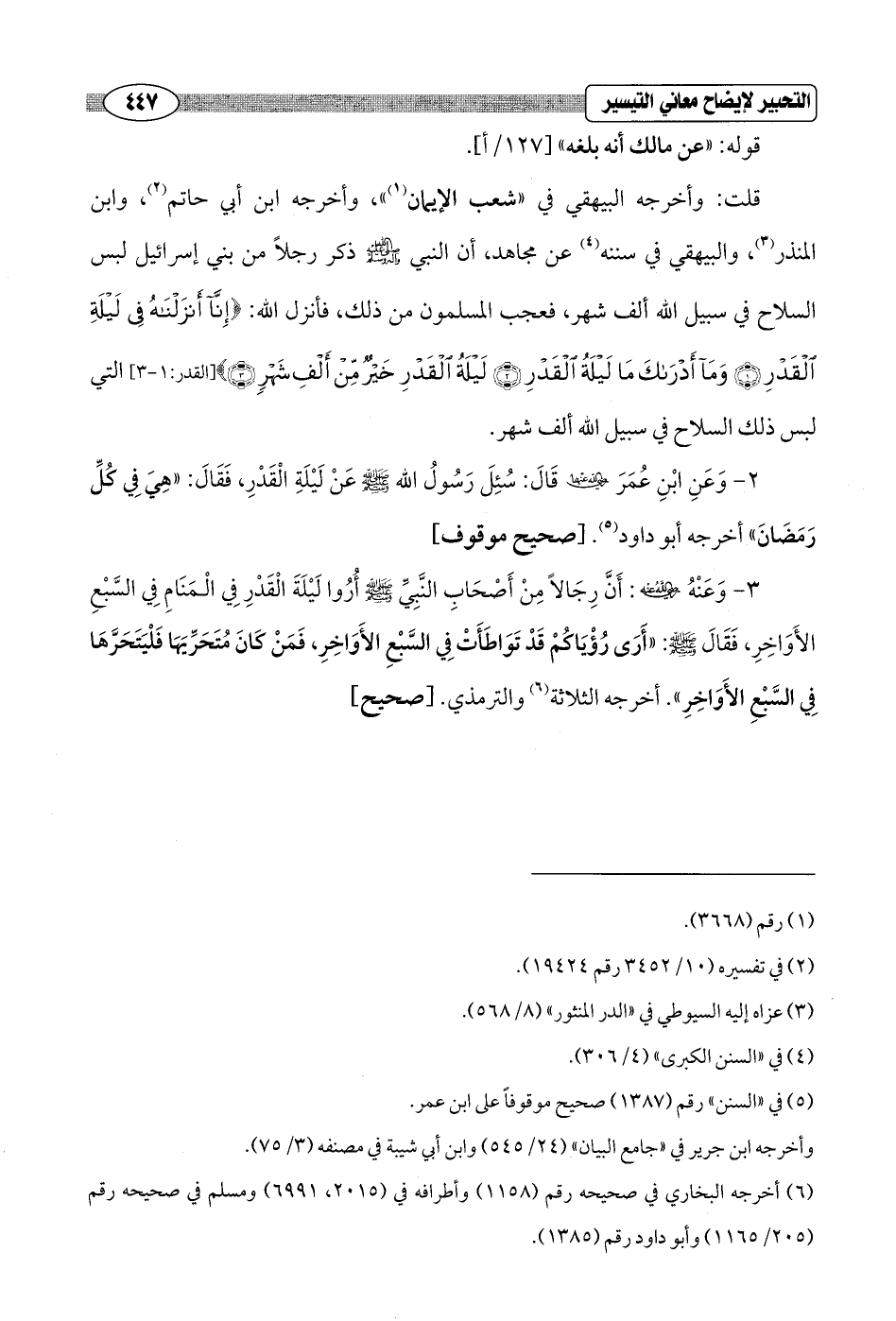 قلت: وأخرجه البيهقي في "شعب الإيمان (¬1) "، وأخرجه ابن أبي حاتم (¬2)، وابن المنذر (¬3)، والبيهقي في سننه (¬4) عن مجاهد، أن النبي - صلى الله عليه وسلم - ذكر رجلاً من بني إسرائيل لبس السلاح في سبيل الله ألف شهر، فعجب المسلمون من ذلك، فأنزل الله: {إِنَّا أَنْزَلْنَاهُ فِي لَيْلَةِ الْقَدْرِ (1) وَمَا أَدْرَاكَ مَا لَيْلَةُ الْقَدْرِ (2) لَيْلَةُ الْقَدْرِ خَيْرٌ مِنْ أَلْفِ شَهْرٍ (3)} [القدر: 1 - 3] التي لبس ذلك السلاح في سبيل الله ألف شهر.