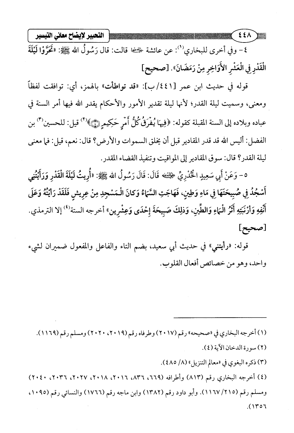 قوله في حديث ابن عمر [441/ ب]: "قد تواطأت" بالهمز، أي: توافقت لفظاً ومعنى، وسميت ليلة القدرة لأنها ليلة تقدير الأمور والأحكام يقدر الله فيها أمر السنة في عباده وبلاده إلى السنة المقبلة كقوله: {فِيهَا يُفْرَقُ كُلُّ أَمْرٍ حَكِيمٍ (4)} (¬2) قيل: للحسين (¬3) بن الفضل: أليس الله قد قدر المقادير قبل أن يخلق السموات والأرض؟ قال: نعم، قيل: فما معنى ليلة القدر؟ قال: سوق المقادير إلى المواقيت وتنفيذ القضاء المقدر.