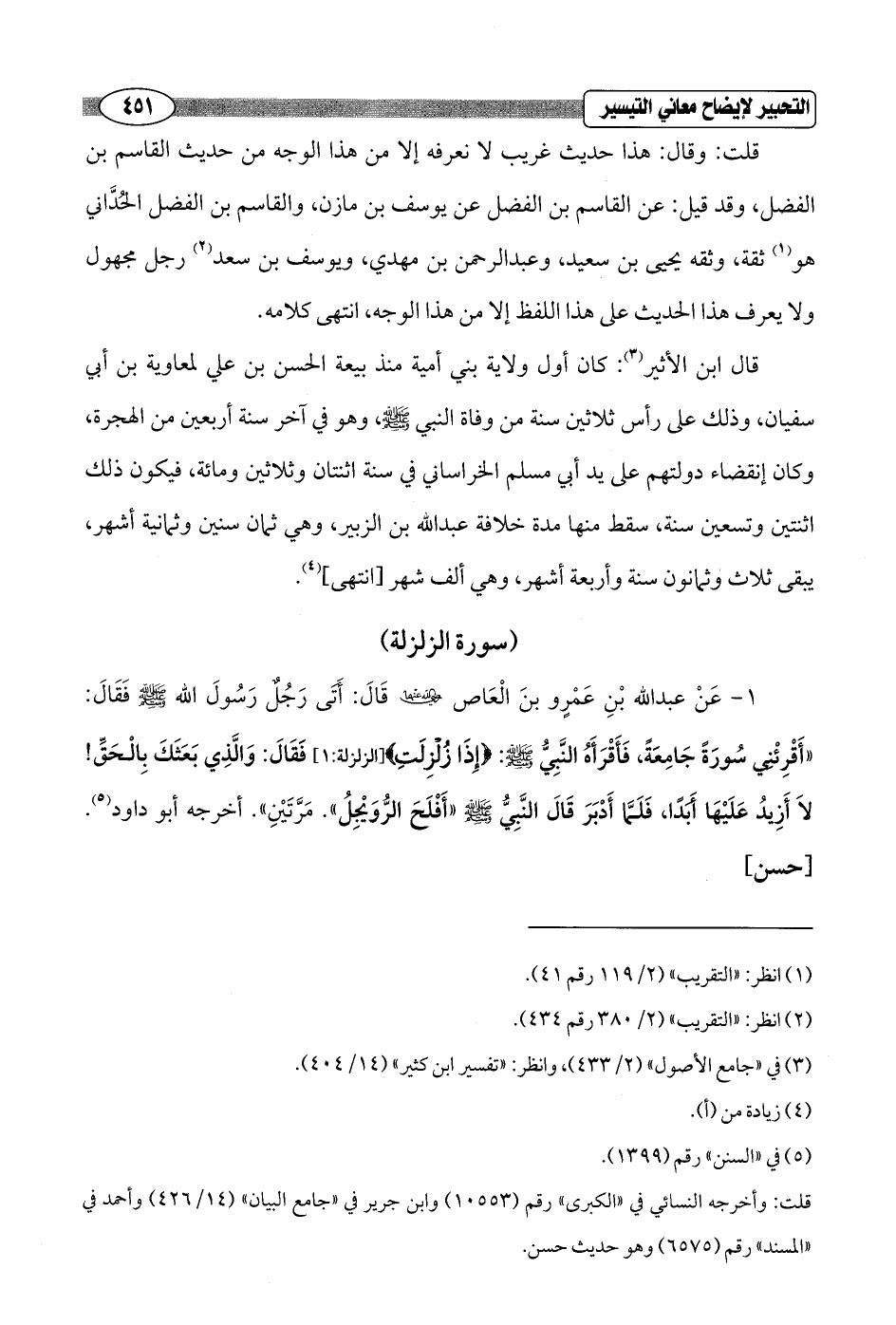 1 - عَنْ عبد الله بْنِ عَمْرٍو بنَ الْعاص - رضي الله عنهما - قَالَ: أَتَى رَجُلٌ رَسُولَ الله - صلى الله عليه وسلم - فَقَالَ: "أَقْرِئْنِي سُورَةً جَامِعَةً، فَأَقْرَأَهُ النَّبِيُّ - صلى الله عليه وسلم - {إِذَا زُلْزِلَتِ} [الزلزلة: 1] فَقَالَ: والَّذِي بَعَثَكَ بِالْحَقِّ! لا أَزِيدُ عَلَيْها أبدًا، فَلَمَّا أَدْبَرَ قَالَ النَّبِيُّ - صلى الله عليه وسلم - "أَفْلَحَ الرُّوَيْجِلُ". مَرَّتَيْنِ". أخرجه أبو داود (¬5). [حسن]
