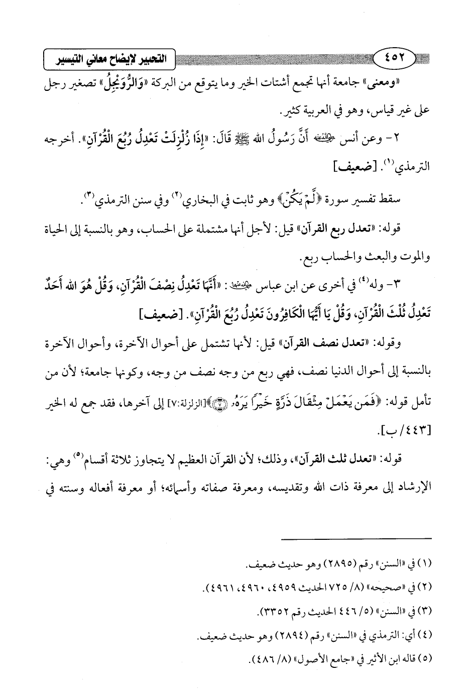 2 - وعن أنس - رضي الله عنه - أَنَّ رَسُولُ الله - صلى الله عليه وسلم - قَالَ: "إِذا زُلْزِلَتْ تَعْدِلُ رُبُعَ الْقُرْآنِ". أخرجه الترمذي (¬1). [ضعيف]