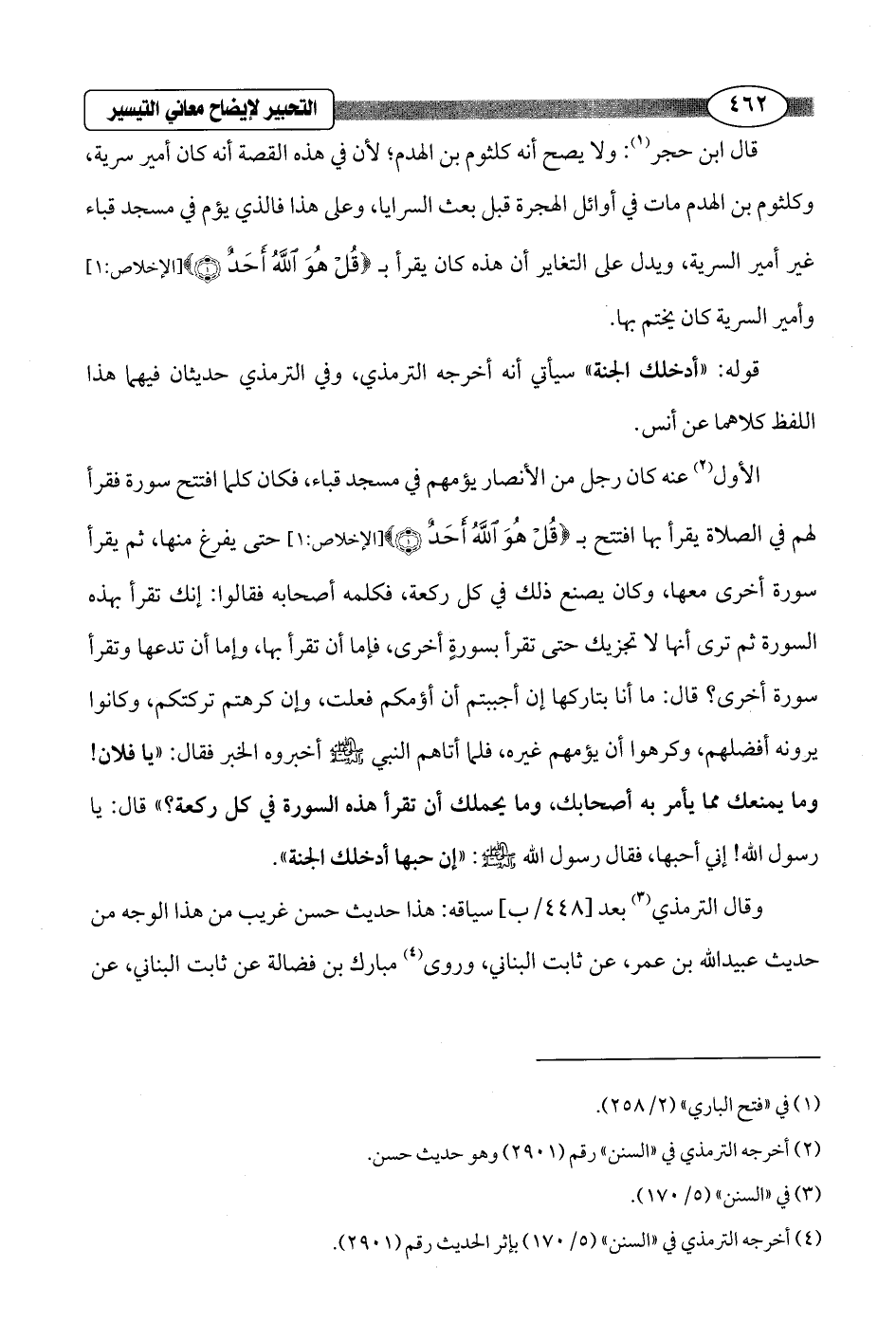 الأول (¬2) عنه كان رجل من الأنصار يؤمهم في مسجد قباء، فكان كلما افتتح سورة فقرأ لهم في الصلاة يقرأ بها افتتح بـ {قُلْ هُوَ اللَّهُ أَحَدٌ (1)} [الإخلاص: 1] حتى يفرغ منها، ثم يقرأ سورة أخرى معها، وكان يصنع ذلك في كل ركعة، فكلمه أصحابه فقالوا: إنك تقرأ بهذه السورة ثم ترى أنها لا تجزيك حتى تقرأ بسورةٍ أخرى، فإما أن تقرأ بها، وإما أن تدعها وتقرأ سورة أخرى؟ قال: ما أنا بتاركها إن أجببتم أن أؤمكم فعلت، وإن كرهتم تركتكم، وكانوا يرونه أفضلهم، وكرهوا أن يؤمهم غيره، فلما أتاهم النبي - صلى الله عليه وسلم - أخبروه الخبر فقال: "يا فلان! وما يمنعك مما يأمر به أصحابك، وما يحملك أن تقرأ هذه السورة في كل ركعة؟ " قال: يا رسول الله! إني أحبها، فقال رسول الله - صلى الله عليه وسلم -: "إن حبها أدخلك الجنة".