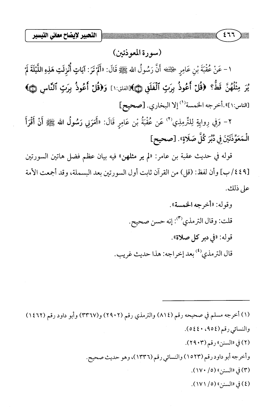 1 - عَنْ عُقْبَةَ بْنِ عَامِرٍ - رضي الله عنه - أَنَّ رَسُولُ الله - صلى الله عليه وسلم - قَالَ: "أَلمْ تَرَ: آيَاتٍ أُنْزِلَتِ هَذِهِ اللَّيْلَةَ لَمْ يُرَ مِثْلُهُنَّ قَطُّ؟ {قُلْ أَعُوذُ بِرَبِّ الْفَلَقِ (1)} [الفلق: 1] وَ {قُلْ أَعُوذُ بِرَبِّ النَّاسِ (1)} [الناس: 1] ". أخرجه الخمسة (¬1) إلا البخاري. [صحيح]