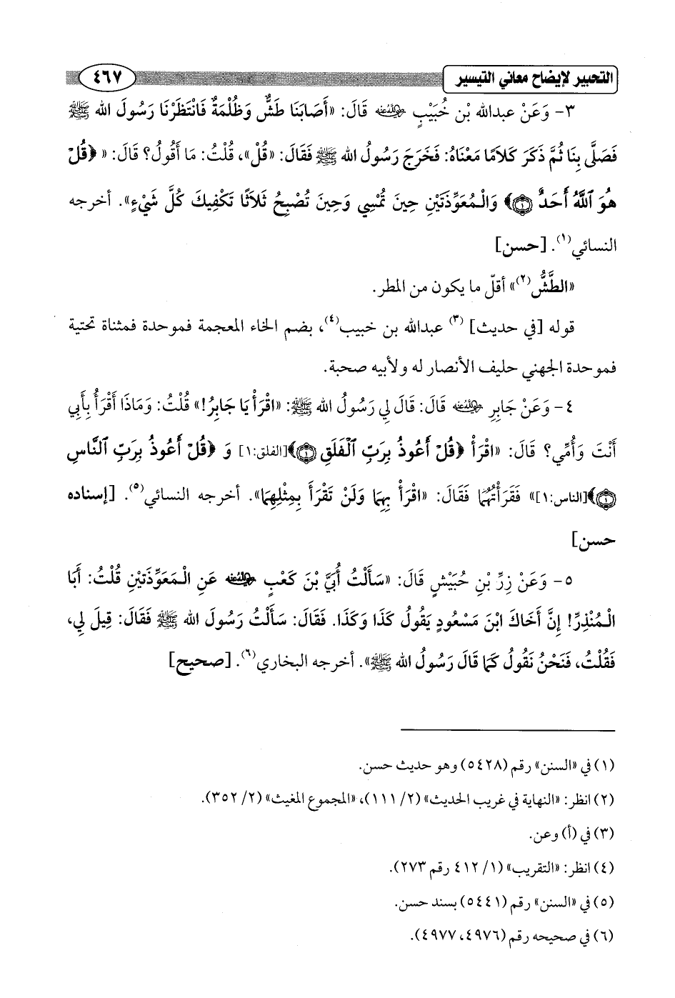 4 - وَعَنْ جَابِرِ - رضي الله عنه - قَالَ: قَالَ لِي رَسُول الله - صلى الله عليه وسلم -: "اقْرَأْ يَا جابِرُ! " قُلْتُ: وَمَاذَا أَقْرأُ بِأَبِي أَنْتَ وَأُمِّي؟ قَالَ: "اقْرَأْ {قُلْ أَعُوذُ بِرَبِّ الْفَلَقِ (1)} [الفلق: 1] وَ {قُلْ أَعُوذُ بِرَبِّ النَّاسِ (1)} [الناس: 1] " فَقَرَأْتُهُمَا فَقَالَ: "اقْرَأْ بِهِمَا وَلَنْ تَقْرَأَ بِمِثْلِهِمَا". أخرجه النسائي (¬5). [إسناده حسن]