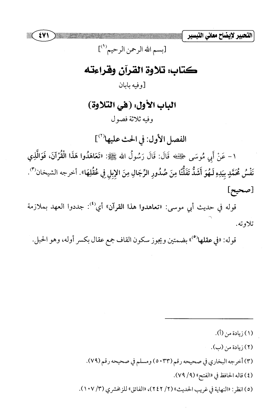 1 - عَنْ أَبِي مُوسَى - رضي الله عنه - قَالَ: قَالَ رَسُولُ الله - صلى الله عليه وسلم -: "تَعَاهَدُوا هَذَا الْقُرْآنَ، فَوَالَّذِي نَفْسُ مُحَمَّدٍ بِيَدِهِ لَهُوَ أَشَدُّ تَفَلُّتًا مِنَ صُدُورِ الرِّجَالِ مِنَ الإِبِلِ فِي عُقُلِهَا". أخرجه الشيخان (¬3). [صحيح]