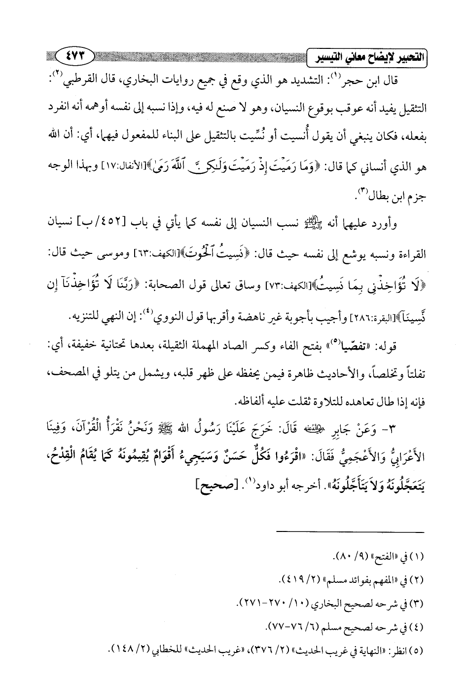قوله: "تفصّيا (¬5) " بفتح الفاء وكسر الصاد المهملة الثقيلة، بعدها تحتانية خفيفة، أي: تفلتاً وتخلصاً، والأحاديث ظاهرة فيمن يحفظه على ظهر قلبه، ويشمل من يتلو في المصحف، فإنه إذا طال تعاهده للتلاوة ثقلت عليه ألفاظه.
