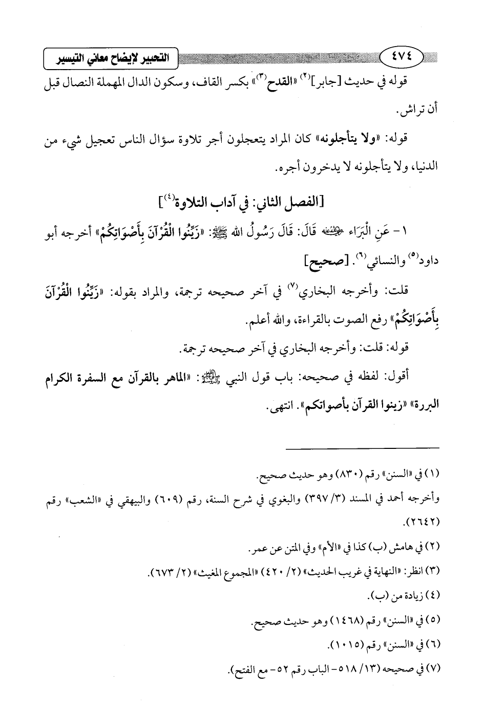 1 - عَنِ اْلبَرَاء - رضي الله عنه - قَالَ: قَالَ رَسُولُ الله - صلى الله عليه وسلم -: "زَيِّنُوا الْقُرْآنَ بِأَصْواتِكُمْ" أخرجه أبو داود (¬4) والنسائي (¬5). [صحيح]