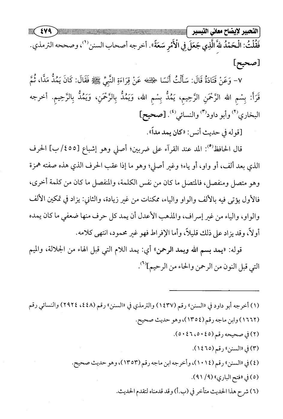 7 - وَعَنْ قَتَادَةُ قَالَ: سَأَلْتُ أنَسًا - رضي الله عنه - عَنْ قِراءَةِ النَّبِيِّ - صلى الله عليه وسلم - فَقَالَ: كَانَ يَمُدُّ مَدًّا، ثُمَّ قَرَأَ: بِسْمِ الله الرَّحْمَنِ الرَّحِيمِ، يَمُدُّ بِسْمِ الله، وَيمُدُّ بِالرَّحْمَنِ، وَيَمُدُّ بِالرَّحِيمِ. أخرجه البخاري (¬2) وأبو داود (¬3) والنسائي (¬4). [صحيح]