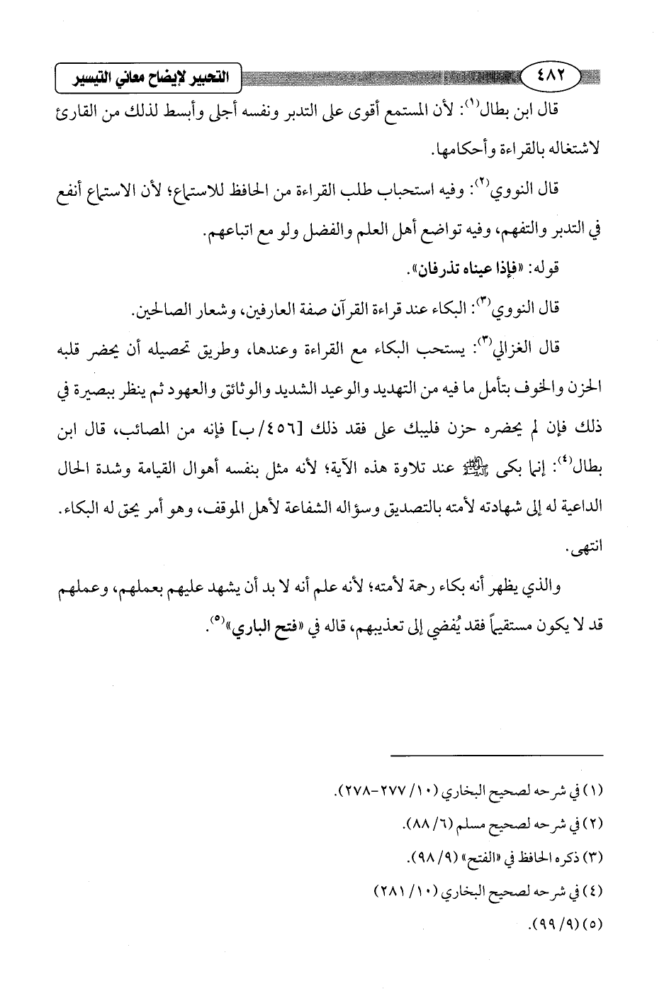 قال الغزالي (3): يستحب البكاء مع القراءة وعندها، وطريق تحصيله أن يحضر قلبه الحزن والخوف بتأمل ما فيه من التهديد والوعيد الشديد والوثائق والعهود ثم ينظر ببصيرة في ذلك فإن لم يحضره حزن فليبك على فقد ذلك [456/ ب] فإنه من المصائب، قال ابن بطال (¬4): إنما بكى - صلى الله عليه وسلم - عند تلاوة هذه الآية؛ لأنه مثل بنفسه أهوال القيامة وشدة الحال الداعية له إلى شهادته لأمته بالتصديق وسؤاله الشفاعة لأهل الموقف، وهو أمر يحق له البكاء. انتهى.