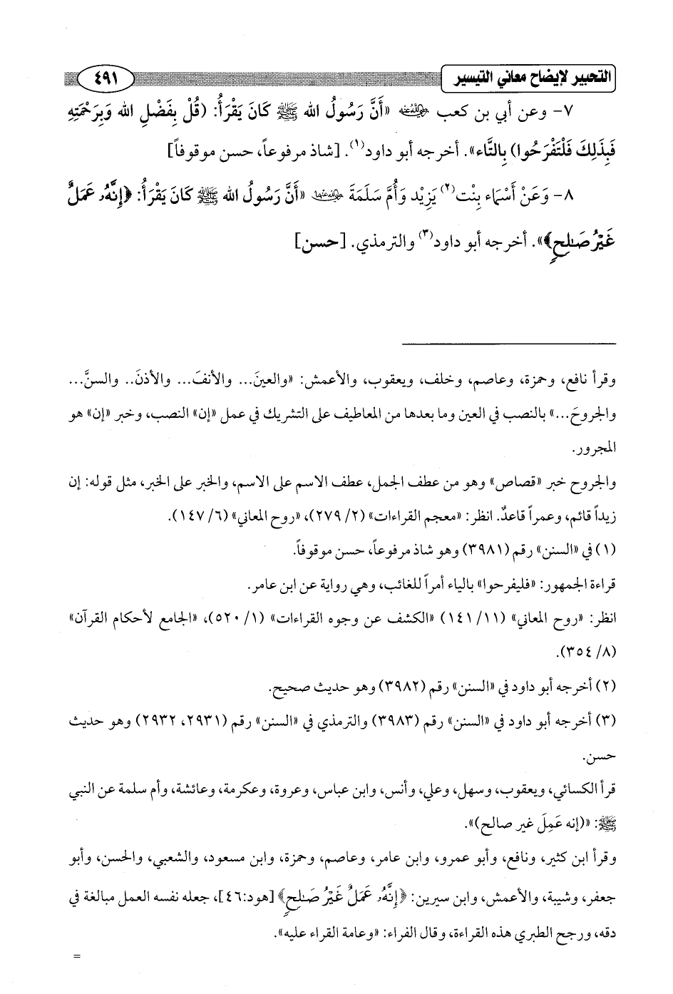 8 - وَعَنْ أَسْماء بِنْت (¬2) يَزِيْد وَأُمَّ سَلَمَةَ - رضي الله عنها - "أَنَّ رَسُولُ الله - صلى الله عليه وسلم - كَانَ يَقْرَأُ: {إِنَّهُ عَمَلٌ غَيْرُ صَالِحٍ} ". أخرجه أبو داود (¬3) والترمذي. [حسن]