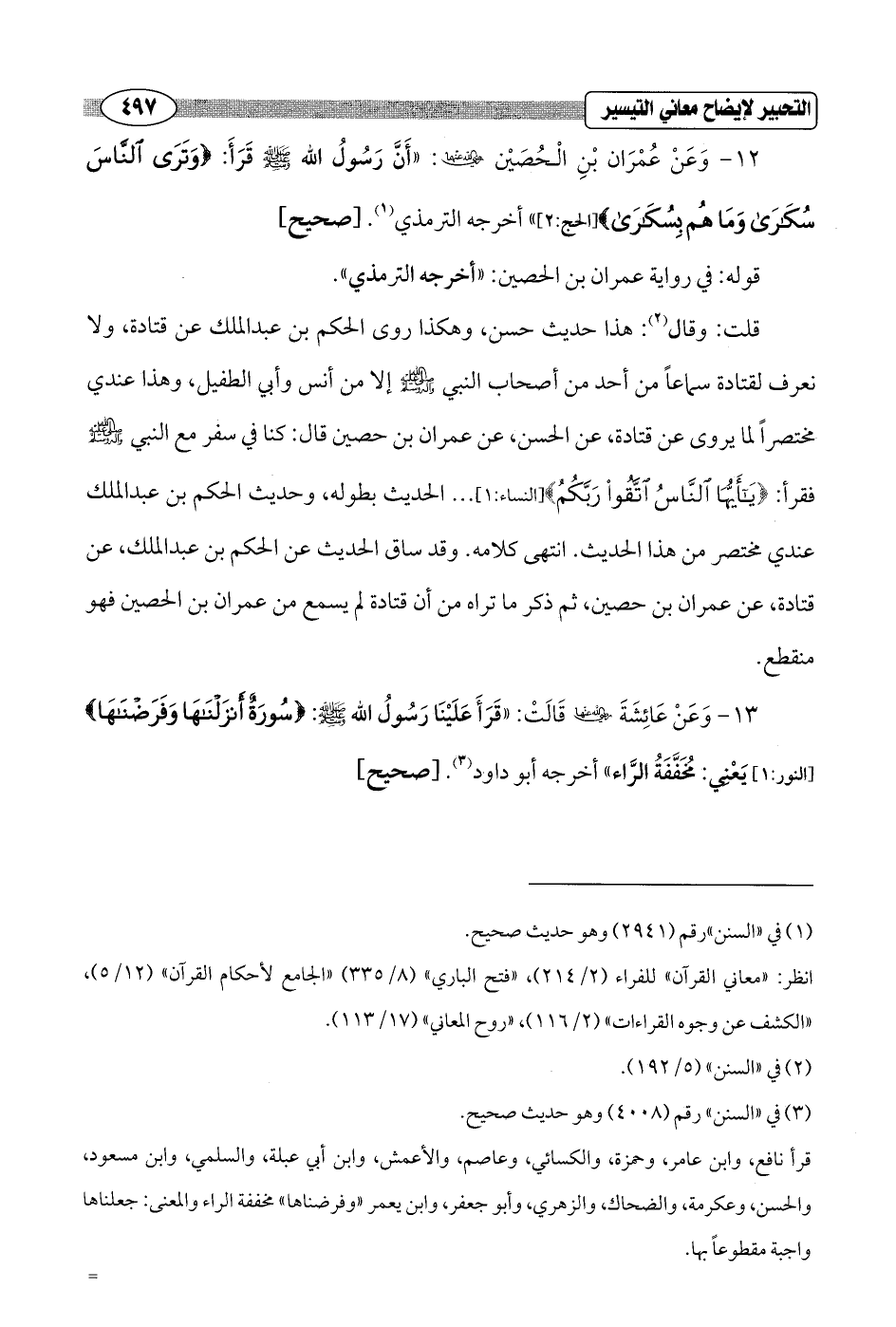 12 - وَعَنْ عُمْرَان بْنِ الْحُصَيْن - رضي الله عنهما -: "أَنَّ رَسُولُ الله - صلى الله عليه وسلم - قَرَأَ: {وَتَرَى النَّاسَ سُكَارَى وَمَا هُمْ بِسُكَارَى} [الحج: 2] " أخرجه الترمذي (¬1). [صحيح]