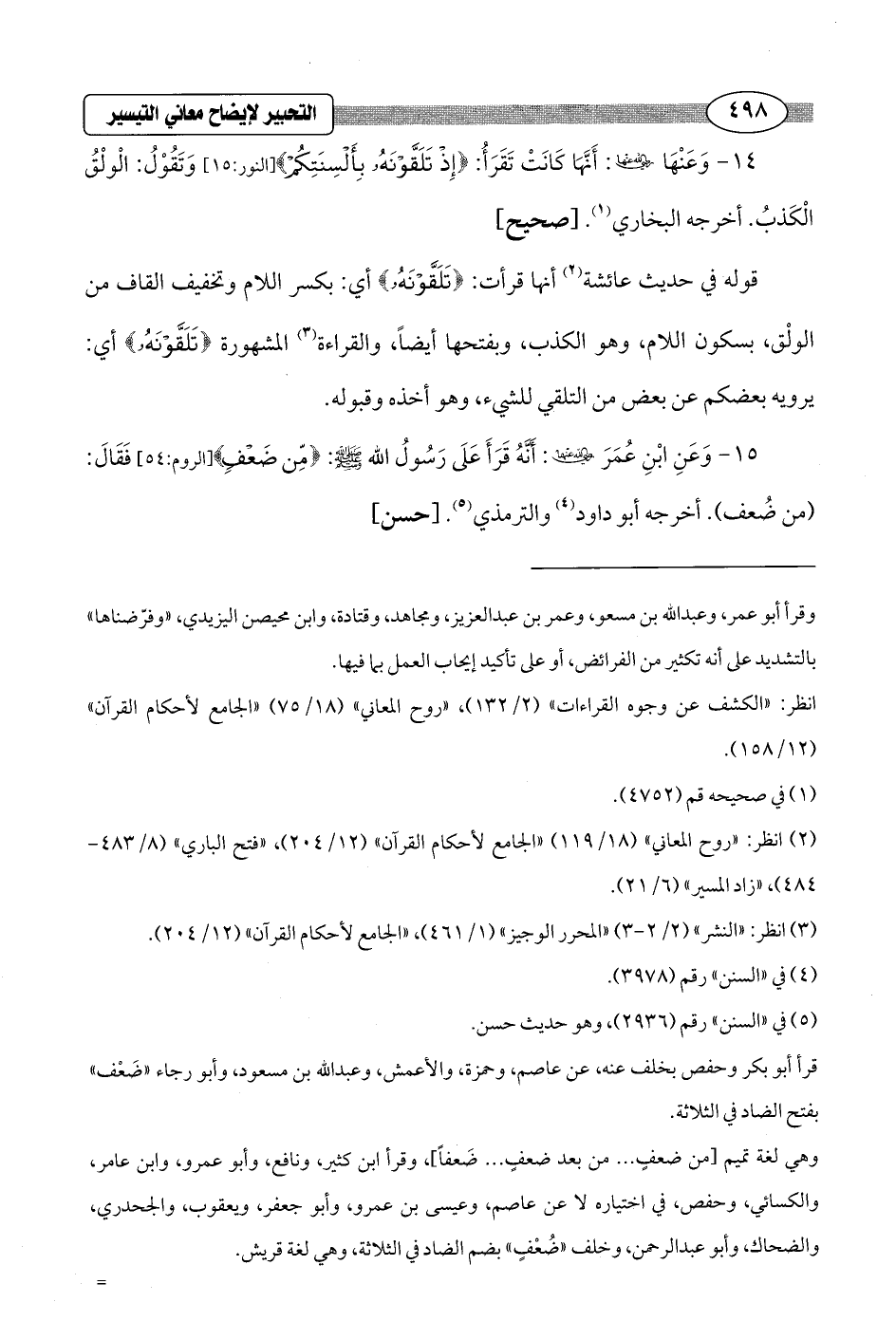 14 - وَعَنْهَا - رضي الله عنها -: أَنَّهَا كَانَتْ تَقَرَأُ: {إِذْ تَلَقَّوْنَهُ بِأَلْسِنَتِكُمْ} [النور: 15] وَتَقُوْلُ: الْولْقُ الْكَذبُ. أخرجه البخاري (¬1). [صحيح]