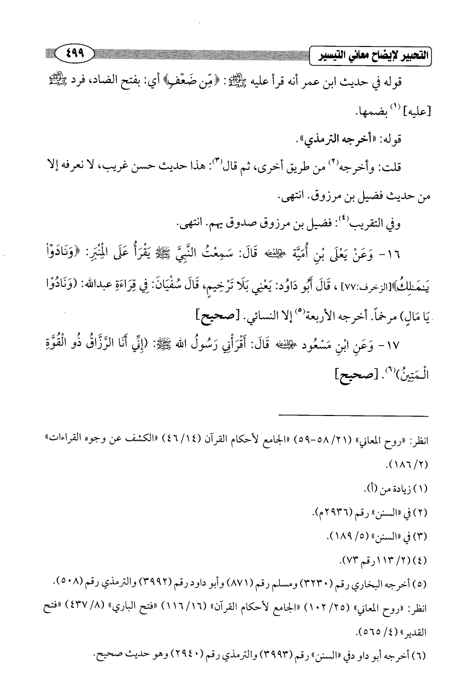16 - وَعَنْ يَعْلَى بْنِ أُمَيَّة - رضي الله عنه - قَالَ: سَمِعْتُ النَّبِيَّ - صلى الله عليه وسلم - يَقْرَأُ عَلَى الْمِنْبَرِ: {وَنَادَوْا يَامَالِكُ} [الزخرف: 77]، قَالَ أَبُو دَاوُد: يَعْنِي بَلَا تَرْخِيمٍ، قَالَ سُفْيَانَ: في قِرَاءَةِ عبد الله: (وَنَادُوْا يَا مَالٍ) مرخماً. أخرجه الأربعة (¬5) إلا النسائي. [صحيح]