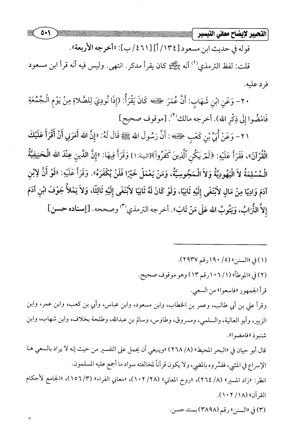 20 - وَعَنِ ابْنِ شَهابٍ: أَنَّ عُمَرَ - رضي الله عنه - كَانَ يَقْرَأُ: (إِذَا نُودِيَ لِلصلاةِ مِنْ يَوْمِ الْجُمُعَةِ فَامْضُوا إِلَى ذِكْرِ الله). أخرجه مالك (¬2). [موقوف صحيح]