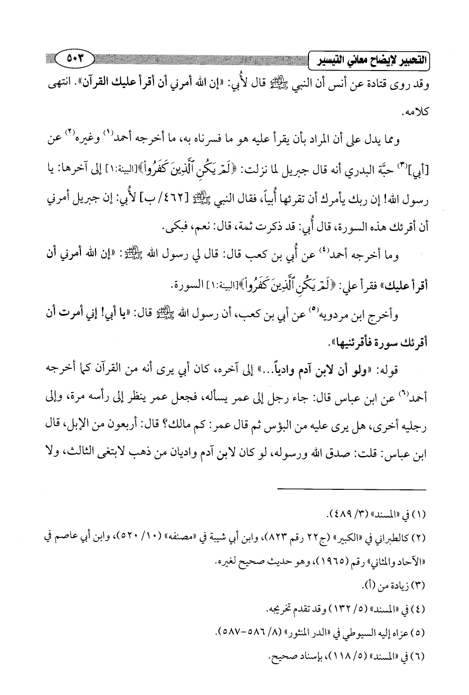 وما أخرجه أحمد (¬4) عن أُبي بن كعب قال: قال لي رسول الله - صلى الله عليه وسلم -: "إن الله أمرني أن أقرأ عليك" فقرأ علي: {لَمْ يَكُنِ الَّذِينَ كَفَرُوا} [البينة: 1] السورة.