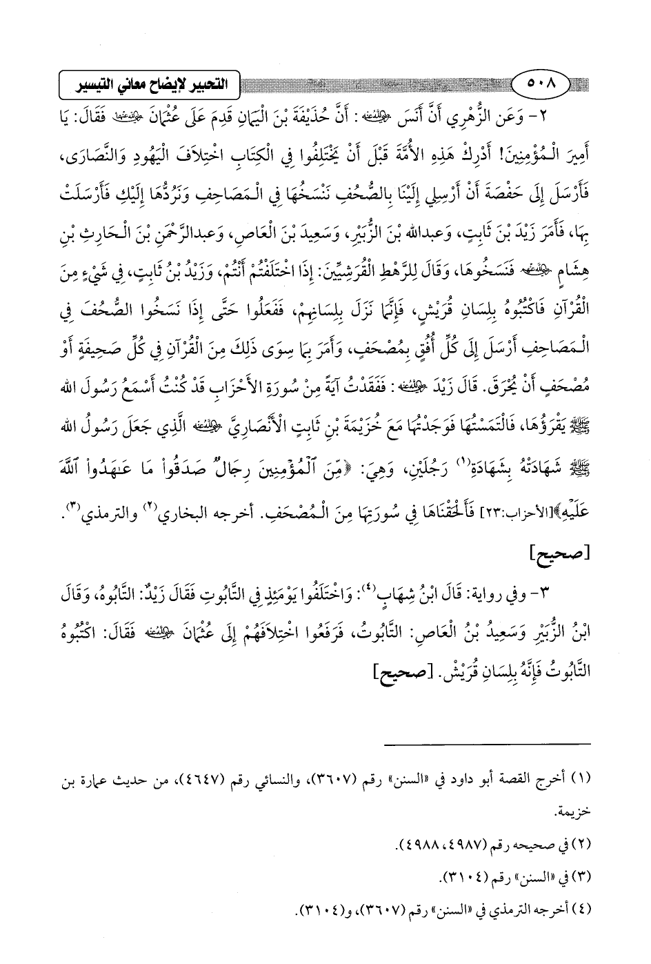 2 - وَعَن الزُّهْرِي أَنَّ أنَسَ - رضي الله عنه -: أَنَّ حُذَيْفَةَ بْنَ الْيَمَانِ قَدِمَ عَلَى عُثْمَانَ - رضي الله عنهما - فَقَالَ: يَا أَمِيرَ الْمُؤْمِنِينَ! أَدْرِكْ هَذِهِ الأُمَّةَ قَبْلَ أَنْ يَخْتَلِفُوا في الْكِتَابِ اخْتِلاَفَ الْيَهُودِ والنَّصارَى، فَأَرْسَلَ إِلَى حَفْصَةَ أَنْ أَرْسِلِي إِلَيْنَا بِالصُّحُفِ نَنْسَخُهَا فِي الْمَصَاحِفِ وَنَرُدُّهَا إِلَيْكِ فَأَرْسَلَتْ بِهَا، فَأَمَرَ زَيْدَ بْنَ ثابِتٍ، وَعبد الله بْنَ الزُّبَيْرِ، وَسَعِيدَ بْنَ الْعاصِ، وَعبد الرَّحْمَنِ بْنَ الْحارِثِ بْنِ هِشَامٍ - رضي الله عنهم - فَنَسَخُوهَا، وَقَالَ لِلرَّهْطِ الْقُرَشِيِّينَ: إِذا اخْتَلَفْتُمْ أَنْتُمْ، وَزَيْدُ بْنُ ثابِتٍ، فِي شَيْءٍ مِنَ الْقُرْآنِ فاكْتُبُوهُ بِلِسانِ قُرَيْشٍ، فَإِنَّمَا نَزَلَ بِلِسَانِهِمْ، فَفَعَلُوا حَتَّى إِذا نَسَخُوا الصُّحُفَ فِي الْمَصَاحِفِ أَرْسَلَ إِلَى كُلِّ أُفُقٍ بِمُصْحَفٍ، وَأَمَرَ بِما سِوَى ذَلِكَ مِنَ الْقُرْآنِ في كُلِّ صَحِيفَةٍ أَوْ مُصْحَفٍ أَنْ يُحْرَقَ. قالَ زَيْدَ - رضي الله عنه -: فَفَقَدْتُ آية مِنْ سُورةِ الأَحْزابِ قَدْ كُنْتُ أَسْمَعُ رَسُولَ الله - صلى الله عليه وسلم - يَقْرَؤُهَا، فالْتَمَسْتُهَا فَوَجَدْتُهَا مَعَ خُزَيْمَةَ بْنِ ثَابِتٍ الْأَنْصَارِيَّ - رضي الله عنه - الَّذِي جَعَلَ رَسُولُ الله - صلى الله عليه وسلم - شَهادَتْهُ بِشَهادَةِ (¬1) رَجُلَيْنِ، وَهِيَ: {مِنَ الْمُؤْمِنِينَ رِجَالٌ صَدَقُوا مَا عَاهَدُوا اللَّهَ عَلَيْهِ} [الأحزاب: 23] فَأَلْحَقْنَاهَا فِي سُورَتِهَا مِنَ الْمُصْحَفِ. أخرجه البخاري (¬2) والترمذي (¬3). [صحيح]