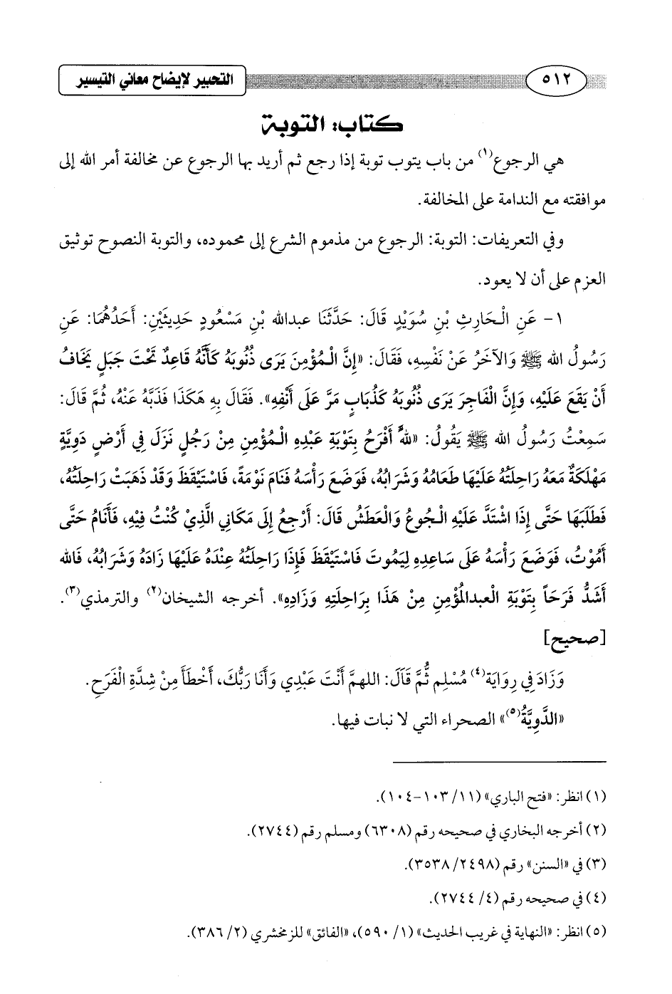 1 - عَنِ الْحَارِثِ بْنِ سُوَيْدٍ قَالَ: حَدَّثَنَا عبد الله بْنِ مَسْعُودٍ حَدِيثَيْنِ: أَحَدُهُمَا: عَنِ رَسُولُ الله - صلى الله عليه وسلم - وَالآخَرُ عَنْ نَفْسِهِ، فَقَالَ: "إِنَّ الْمُؤْمِنَ يَرَى ذُنُوبَهُ كَأَنَّهُ قَاعِدٌ تَحْتَ جَبَلٍ يَخَافُ أَنْ يَقَعَ عَلَيْهِ، وَإِنَّ الْفَاجِرَ يَرَى ذُنُوبَهُ كَذُبَابٍ مَرَّ عَلَى أَنْفِهِ". فَقَالَ بِهِ هَكَذَا فَذَبَّهُ عَنْهُ, ثُمَّ قَالَ: سَمِعْتُ رَسُولُ الله - صلى الله عليه وسلم - يَقُولُ: "لله أَفْرَحُ بِتَوْبَةِ عَبْدِهِ الْمُؤْمِنِ مِنْ رَجُلٍ نَزَلَ فِي أَرْضٍ دَوِيَّةٍ مَهْلكَةٌ مَعَهُ راحِلَتُهُ عَلَيْهَا طَعَامُهُ وَشَرَابُهُ، فَوَضَعَ رَأْسَهُ فَنَامَ نَوْمَةً، فاسْتَيْقَظَ وَقَدْ ذَهَبَتْ راحِلَتُهُ, فَطَلَبَهَا حَتَّى إِذا اشْتَدَّ عَلَيْهِ الْجُوعُ والْعَطَشُ قَالَ: أَرْجِعُ إِلَى مَكَانِي الَّذِيْ كنْتُ فِيْهِ، فأَنَامُ حَتَّى أَمُوْتُ، فَوَضَعَ رَأْسَهُ عَلَى ساعِدِه لِيَمُوتَ فاسْتَيْقَظَ فَإِذَا راحِلَتُهُ عِنْدَهُ عَلَيْهَا زادَهُ وشَرَابُهُ، فَالله أَشَدُّ فَرَحَاً بِتَوْبَةِ الْعبد المُؤْمِنِ مِنْ هَذَا بِرَاحِلَتِهِ وَزَادِهِ". أخرجه الشيخان (¬2) والترمذي (¬3). [صحيح]