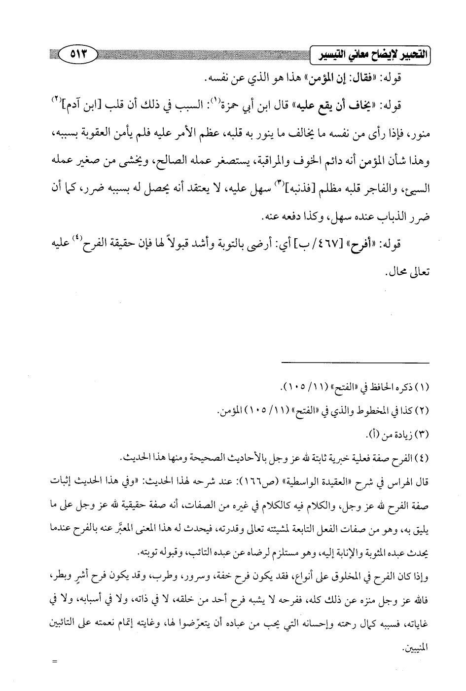 وإذا كان الفرح في المخلوق على أنواع، فقد يكون فرح خفة، وسرور، وطرب، وقد يكون فرح أشرٍ وبطر، فالله عَزَّ وَجَلَّ منزه عن ذلك كله، ففرحه لا يشبه فرح أحد من خلقه، لا في ذاته، ولا في أسبابه، ولا في غاياته، فسببه كمال رحمته وإحسانه التي يحب من عباده أن يتعرّضوا لها، وغايته إتمام نعمته على التائبين المنيبين. =