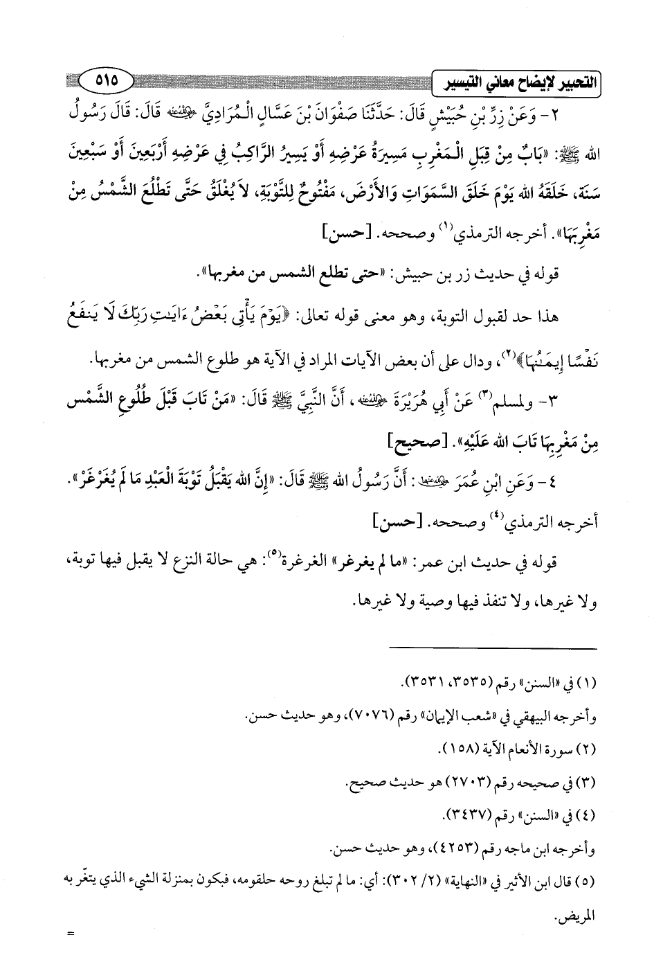 هذا حد لقبول التوبة، وهو معنى قوله تعالى: {يَوْمَ يَأْتِي بَعْضُ آيَاتِ رَبِّكَ لَا يَنْفَعُ نَفْسًا إِيمَانُهَا} (¬2)، ودال على أن بعض الآيات المراد في الآية هو طلوع الشمس من مغربها.