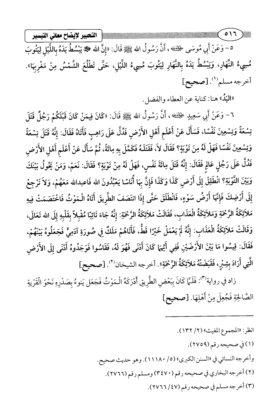 5 - وَعَنْ أَبِي مُوسَى - رضي الله عنه -، أَنَّ رَسُولُ الله - صلى الله عليه وسلم - قَالَ: "إِنَّ الله - عز وجل - يَبْسُطُ يَدَهُ بِاللَّيْلِ لِيَتُوبَ مُسِيءُ النَّهَارِ، وَيَبْسُطُ يَدَهُ بِالنَّهارِ لِيَتُوبَ مُسِيءُ اللَّيْلِ، حَتَّى تَطْلُعَ الشَّمْسُ مِنْ مَغْرِبِهَا". أخرجه مسلم (¬1). [صحيح]