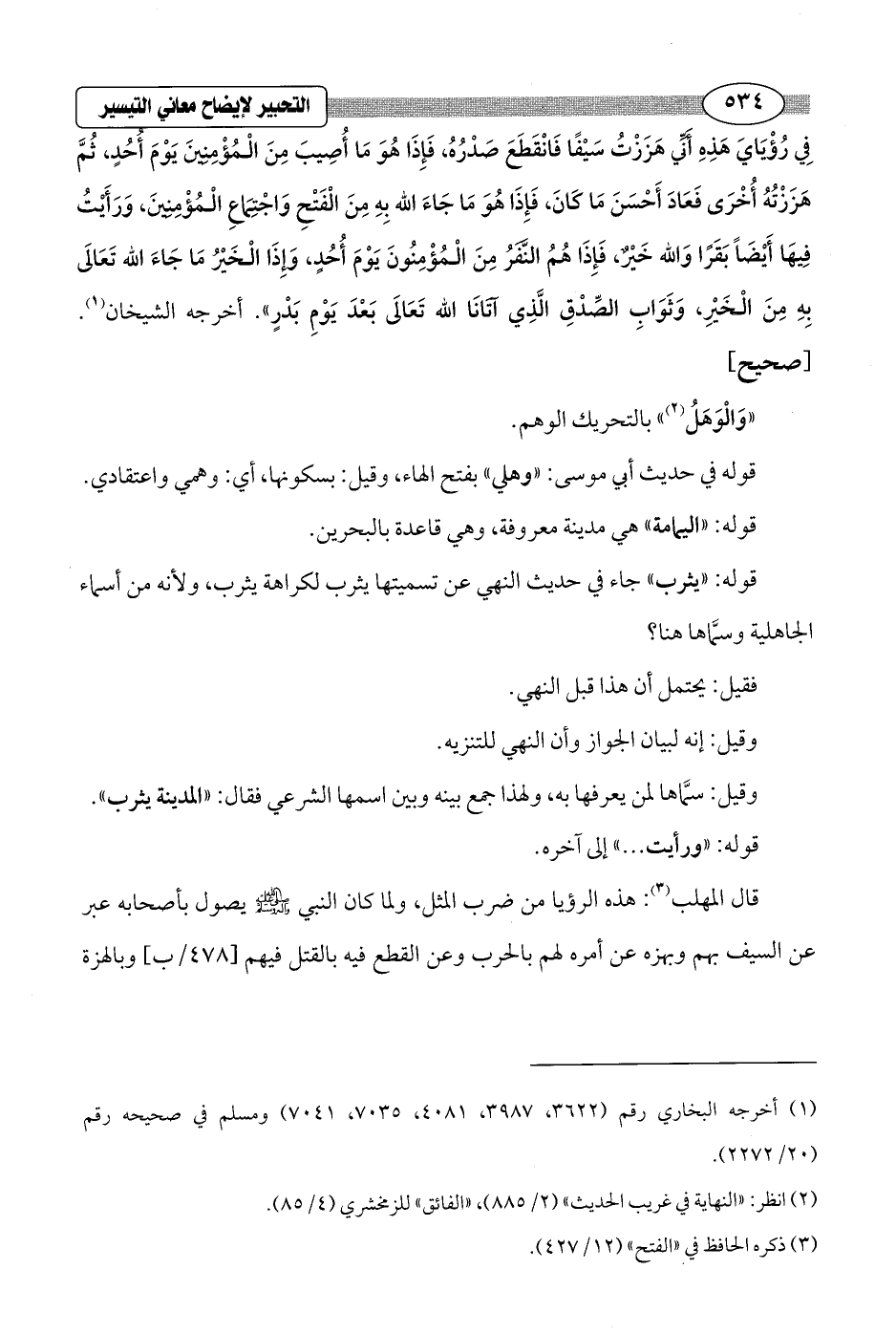 قال المهلب (¬3): هذه الرؤيا من ضرب المثل، ولما كان النبي - صلى الله عليه وسلم - يصول بأصحابه عبر عن السيف بهم وبهزه عن أمره لهم بالحرب وعن القطع فيه بالقتل فيهم [478/ ب] وبالهزة