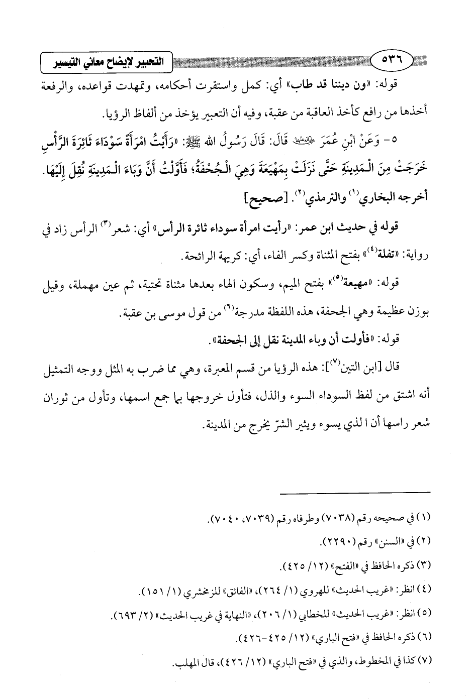 5 - وَعَنْ ابْنِ عُمَرَ - رضي الله عنهما - قَالَ: قَالَ رَسُولُ الله - صلى الله عليه وسلم -: "رَأَيْتُ امْرَأةً سَوْدَاءَ ثَائِرَةَ الرَّأْسِ خَرَجَتْ مِنَ الْمَدِينَةِ حَتَّى نَزَلَتْ بِمَهْيَعَةَ وَهِيَ الْجُحْفَةُ؛ فَأَوَّلْتُ أَنَّ وَبَاءَ الْمَدِينَةِ نُقِلَ إِليْهَا. أخرجه البخاري (¬1) والترمذي (¬2). [صحيح]