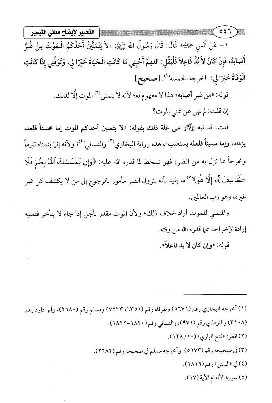 1 - عَنْ أَنَسِ - رضي الله عنه - قَالَ: قَالَ رَسُولُ الله - صلى الله عليه وسلم -: "لاَ يَتَمَنَّيَنَّ أَحَدُكُمُ الْمَوْتَ مِنْ ضُرٍّ أَصَابَهُ، فَإِنْ كَانَ لاَ بُدَّ فَاعِلاً فَلْيَقُلِ: اللهمَّ أَحْيِنِي مَا كَانَتِ الْحَياةُ خَيْرًا لِي، وَتَوَفَّني إِذَا كانَتِ الْوَفاةُ خَيْرًا لِي". أخرجه الخمسة (¬1). [صحيح]