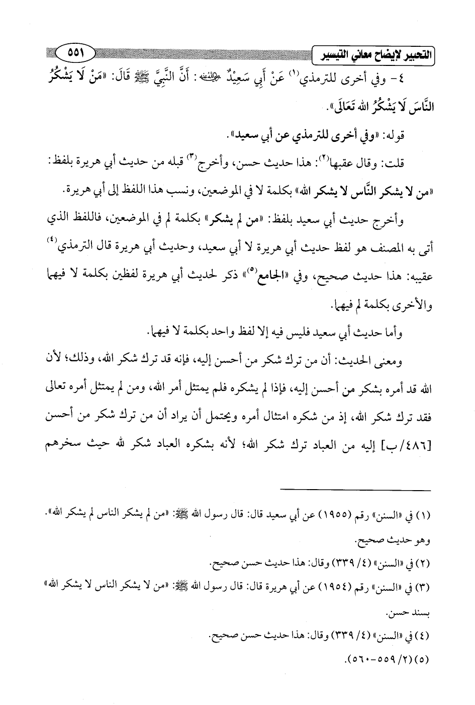(¬1) في "السنن" رقم (1955) عن أبي سعيد قال: قال رسول الله - صلى الله عليه وسلم -: "من لم يشكر الناس لم يشكر الله". وهو حديث صحيح.