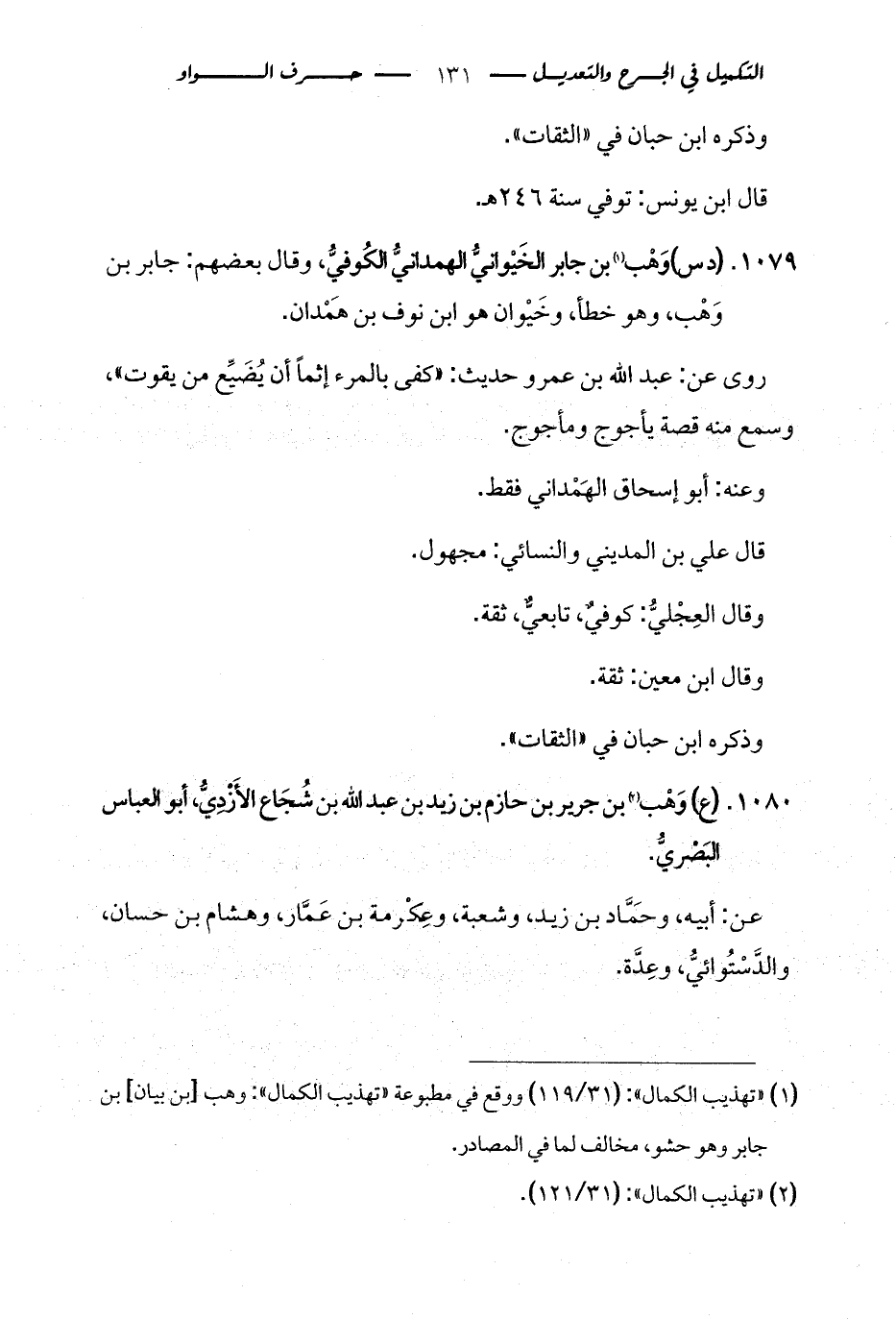 1079 - (د س) وَهْب (¬1) بن جابر الخَيْوانيُّ الهمدانيُّ الكُوفيُّ، وقال بعضهم: جابر بن وَهْب، وهو خطأ، وخَيْوان هو ابن نوف بن هَمْدان.