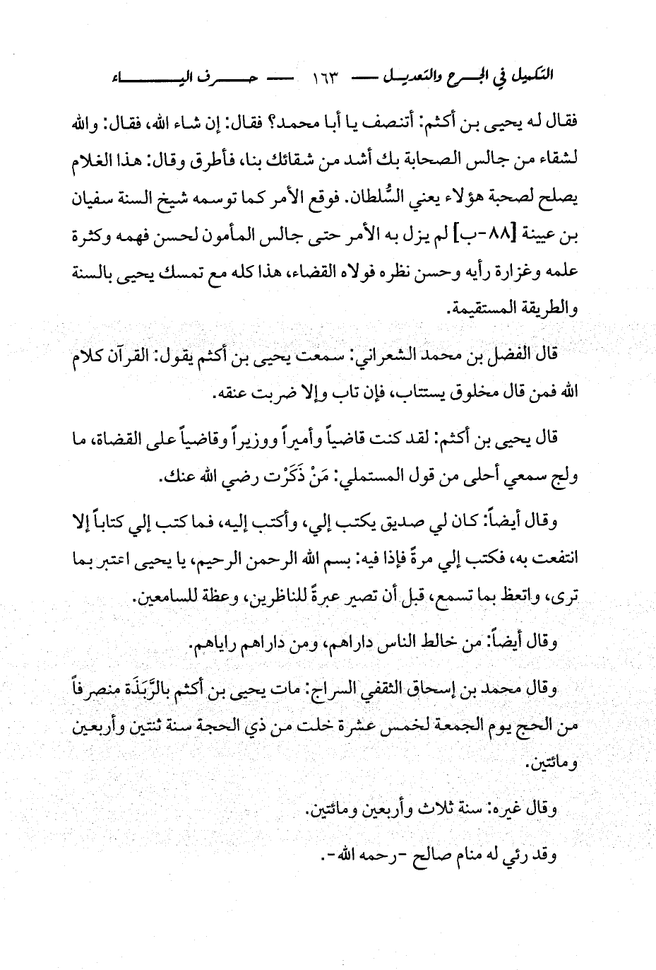 فقال له يحيى بن أكثم: أتنصف يا أبا محمد؟ فقال: إن شاء الله، فقال: والله لشقاء من جالس الصحابة بك أشد من شقائك بنا، فأطرق وقال: هذا الغلام يصلح لصحبة هؤلاء يعني السُّلطان. فوقع الأمر كما توسمه شيخ السنة سفيان بن عيينة [88 - ب] لم يزل به الأمر حتى جالس المأمون لحسن فهمه وكثرة علمه وغزارة رأيه وحسن نظره فولاه القضاء، هذا كله مع تمسك يحيى بالسنة والطريقة المستقيمة.