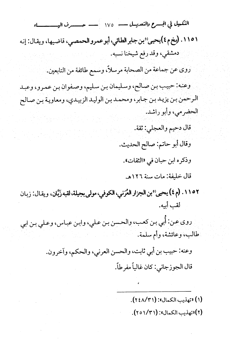 1151 - (بخ م 4) يحيى (¬1) بن جابر الطائي، أبو عمرو الحمصي، قاضيها، ويقال: إنه دمشقي، وقد رفع شيخنا نسبه.