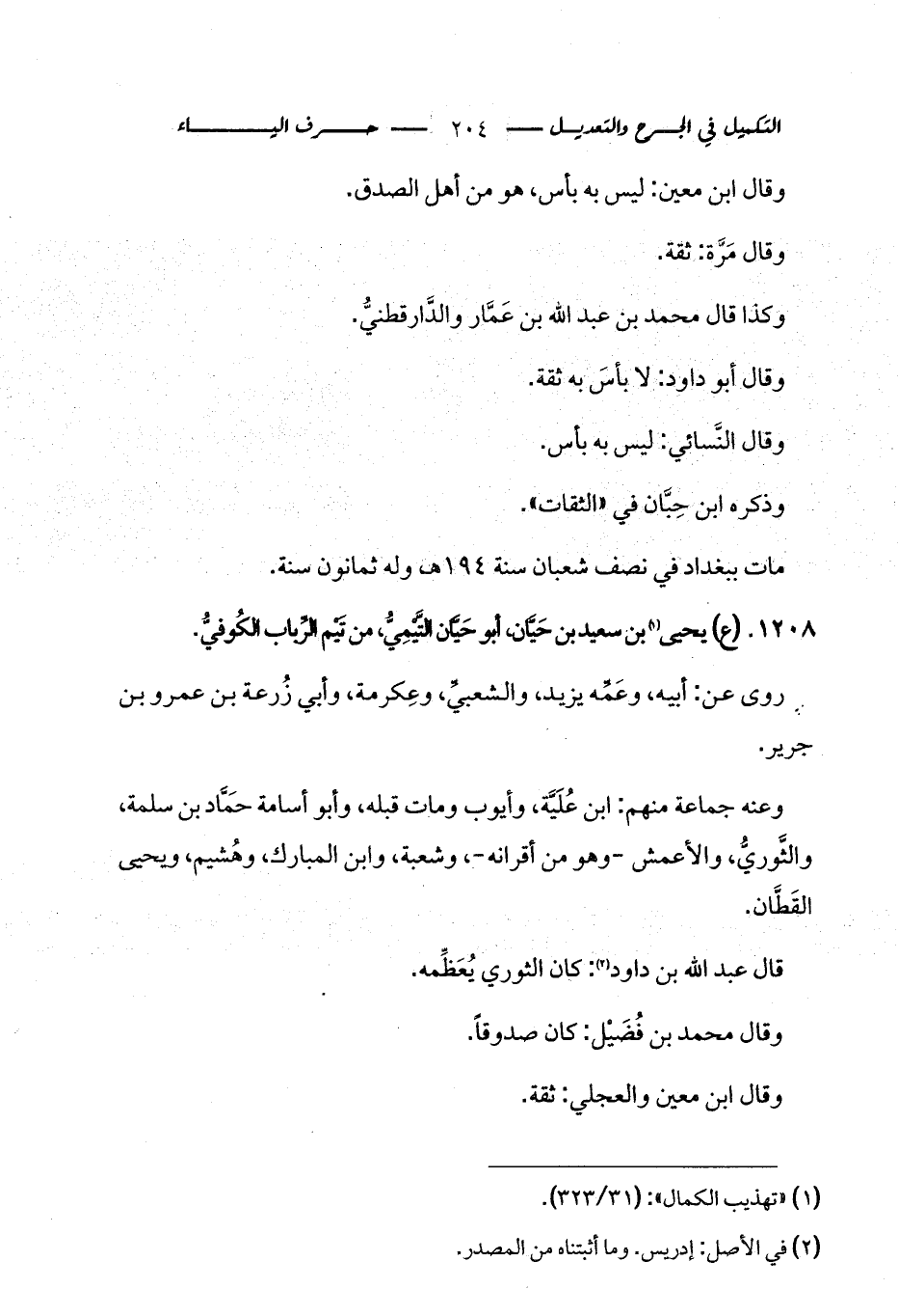1208 - (ع) يحيى (¬1) بن سعيد بن حَيَّان، أبو حَيَّان التَّيْمِيُّ، من تَيْم الرِّباب الكُوفيُّ.