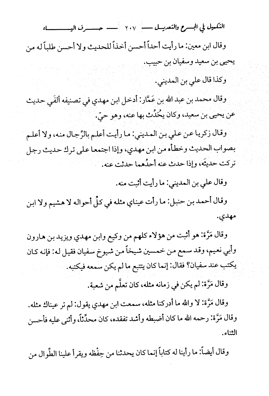 وقال مَرَّة: لا والله ما أدركنا مثله، سمعت ابن مهدي يقول: لم تر عيناك مثله. وقال مَرَّة: رحمه الله ما كان أضبطه وأشد تفقده، كان محدِّثاً، وأثنى عليه فأحسن الثناء.