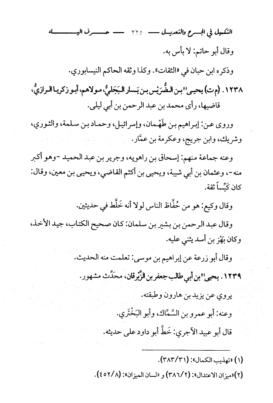 1238 - (م ت) يحيى (¬1) بن الضُّرَيْس بن يَسار البَجَليُّ، مولاهم، أبو زكريا الرازيُّ، قاضيها، رأى محمد بن عبد الرحمن بن أبي ليلى.