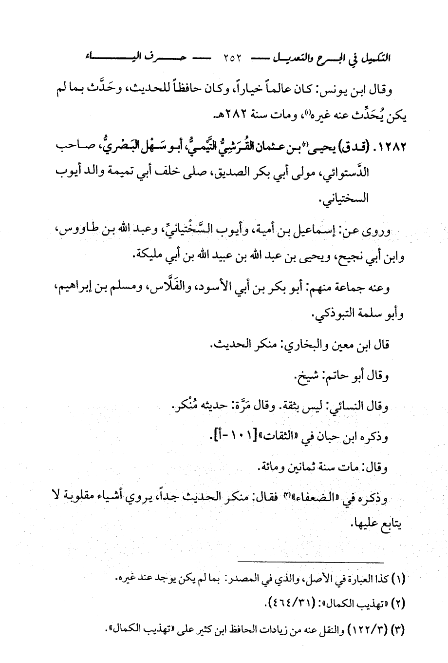 1282 - (قد ق) يحيى (¬2) بن عثمان القُرَشِيُّ التَّيْميُّ، أبو سَهْل البَصْريُّ، صاحب الدَّستوائي، مولى أبي بكر الصديق، صلى خلف أبي تميمة والد أيوب السختياني.