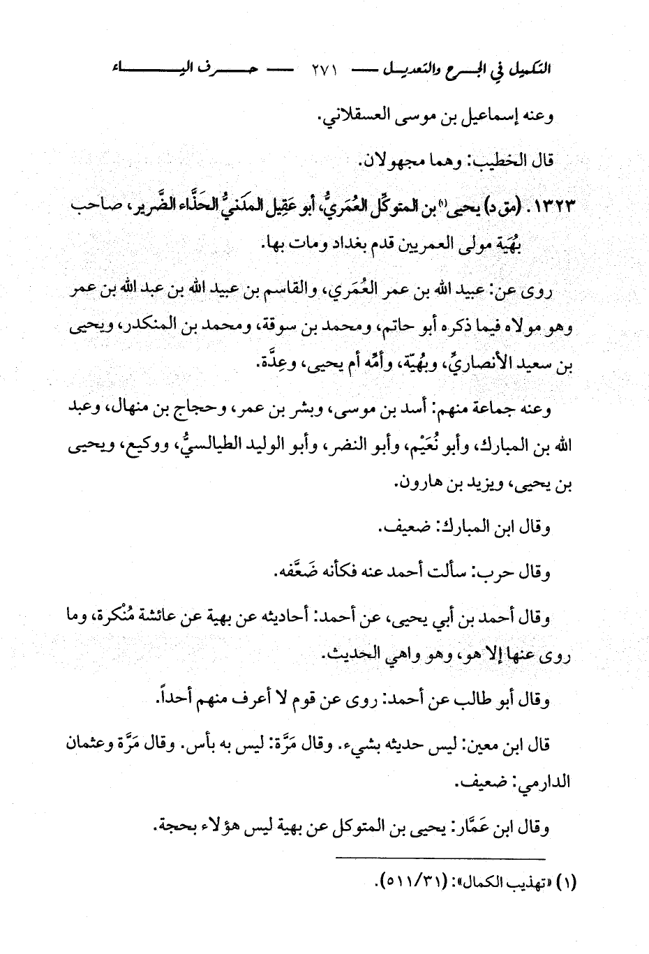 1323 - (مق د) يحيى (¬1) بن المتوكِّل العُمَريُّ، أبو عَقِيل المَدَنيُّ الحَذَّاء الضَّرير، صاحب بُهَية مولى العمريين قدم بغداد ومات بها.