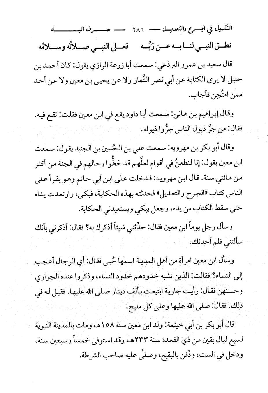 وقال أبو بكر بن مهرويه: سمعت علي بن الحُسين بن الجنيد يقول: سمعت ابن معين يقول: إنا لنطعنُ في أقوام لعلَّهم قد حَطُّوا رحالهم في الجنة من أكثر من مائتي سنة. قال ابن مهرويه: فدخلت على ابن أبي حاتم وهو يقرأ على الناس كتاب «الجرح والتعديل» فحدثته بهذه الحكاية، فبكى، وارتعدت يداه حتى سقط الكتاب من يده، وجعل يبكي ويستعيدني الحكاية.