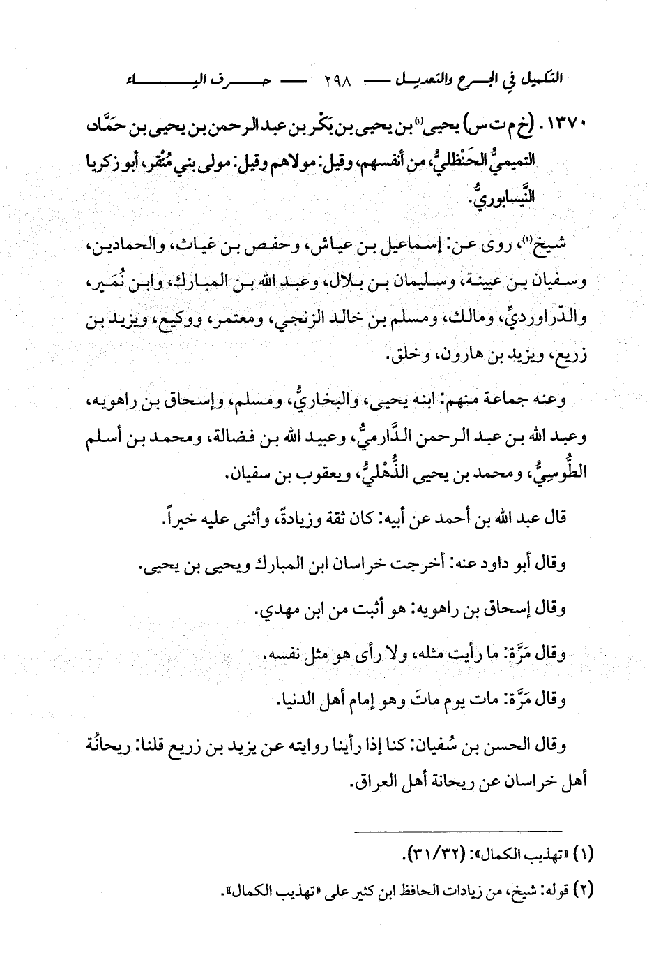 1370 - (خ م ت س) يحيى (¬1) بن يحيى بن بَكْر بن عبد الرحمن بن يحيى بن حَمَّاد، التميميُّ الحَنْظليُّ، من أنفسهم، وقيل: مولاهم وقيل: مولى بني مُنْقر، أبو زكريا النَّيسابوريُّ.