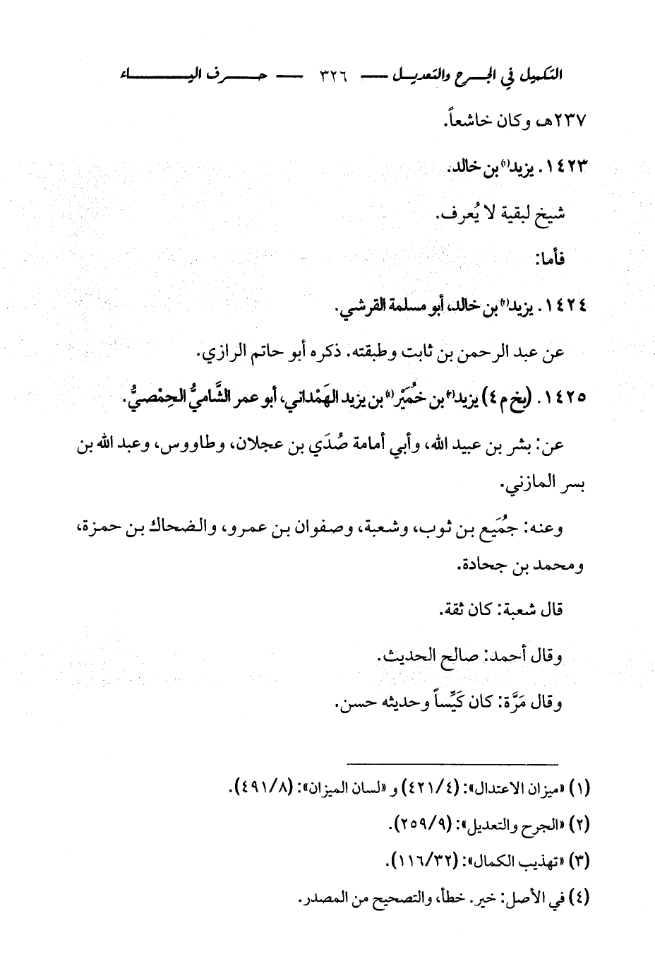 1425 - (بخ م 4) يزيد (¬3) بن خُمَيْر (¬4) بن يزيد الهَمْداني، أبو عمر الشَّاميُّ الحِمْصيُّ.