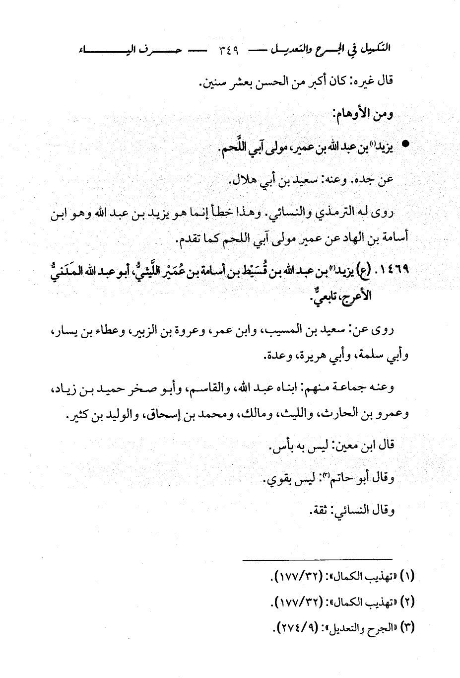 1469 - (ع) يزيد (¬2) بن عبد الله بن قُسَيْط بن أسامة بن عُمَيْر اللَّيثيُّ، أبو عبد الله المَدَنيُّ الأعرج، تابعيٌّ.