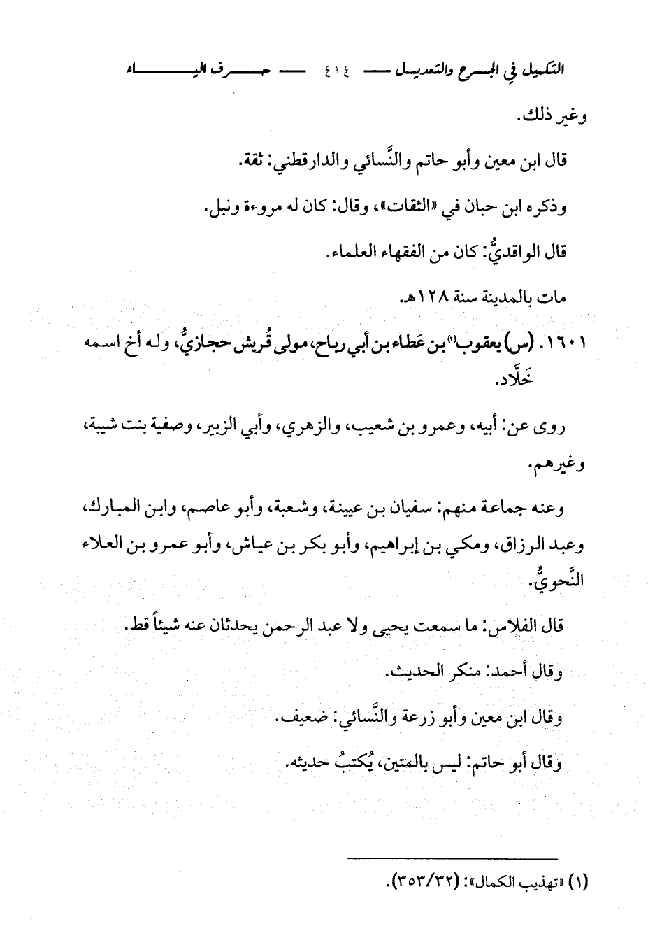 1601 - (س) يعقوب (¬1) بن عَطاء بن أبي رباح، مولى قُريش حجازيُّ، وله أخ اسمه خَلَّاد.